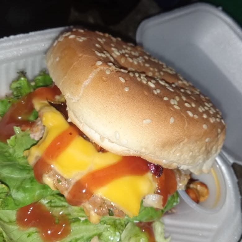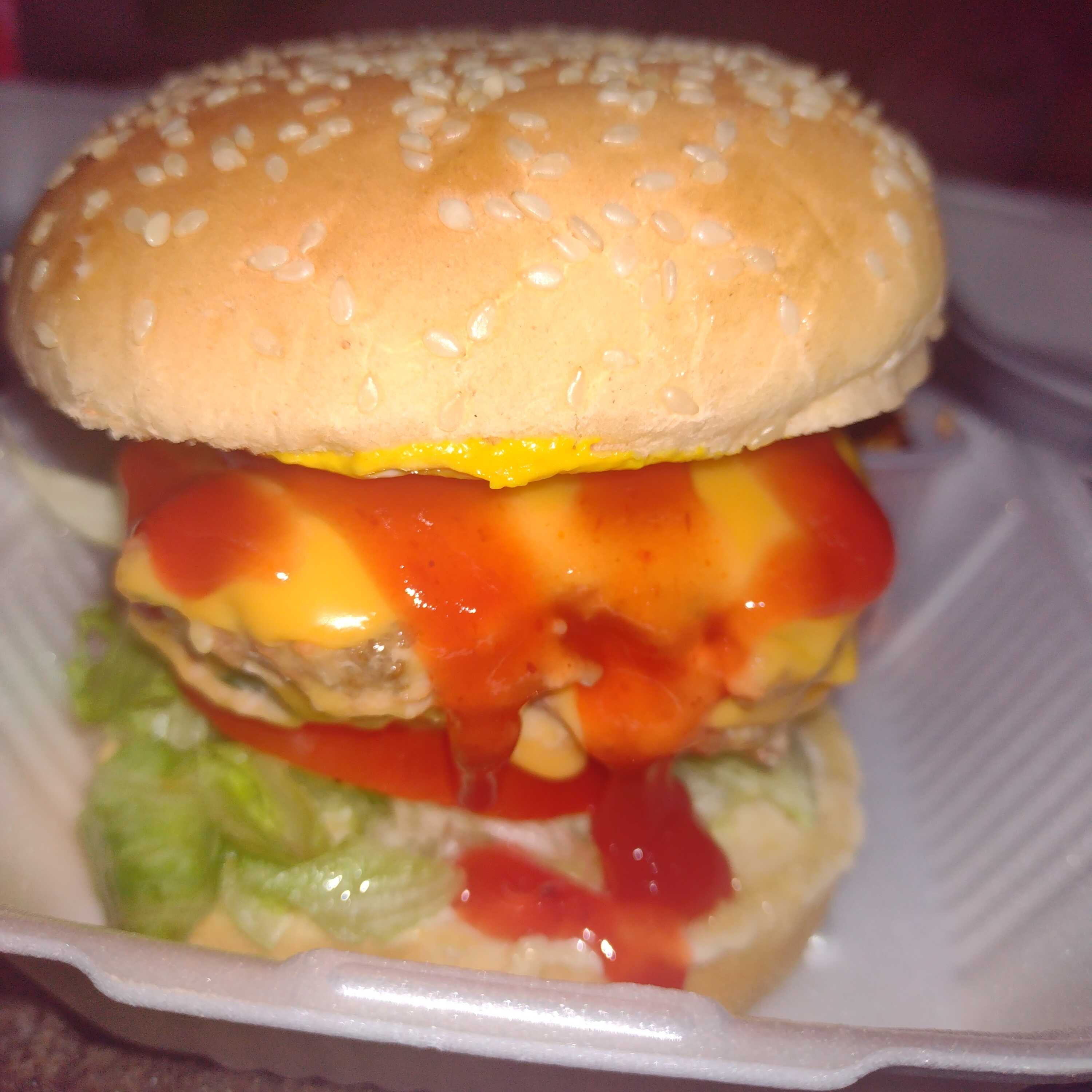 Una hamburguesa con pan hamburguesa lechuga, jitomate, cebolla, dos carne ambas carnes, queso amarillo, catsup, mostaza mayonesa