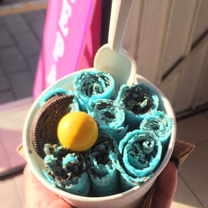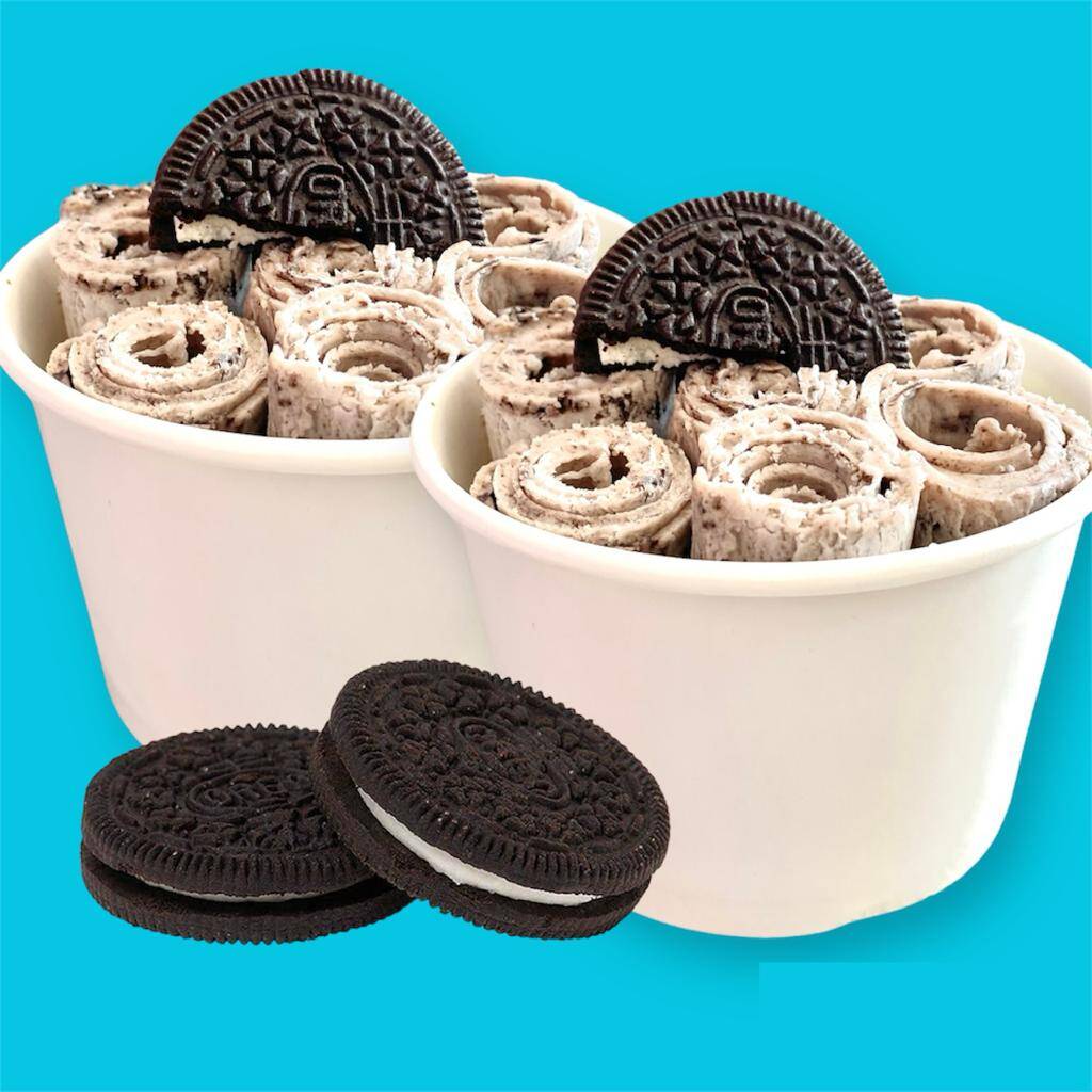 Helado en rollo de base cremosa, mezclada de chicle azul, galletas oreo y 2 toppings a elegir.