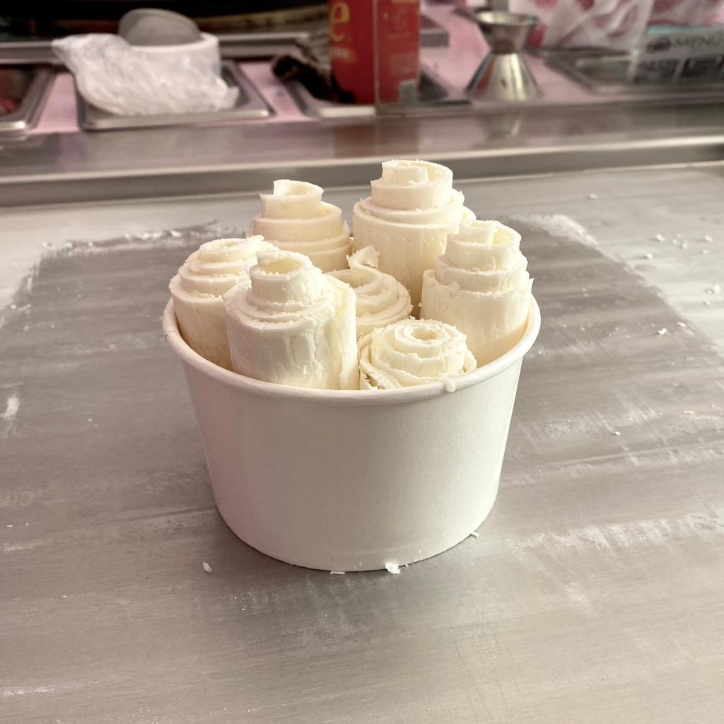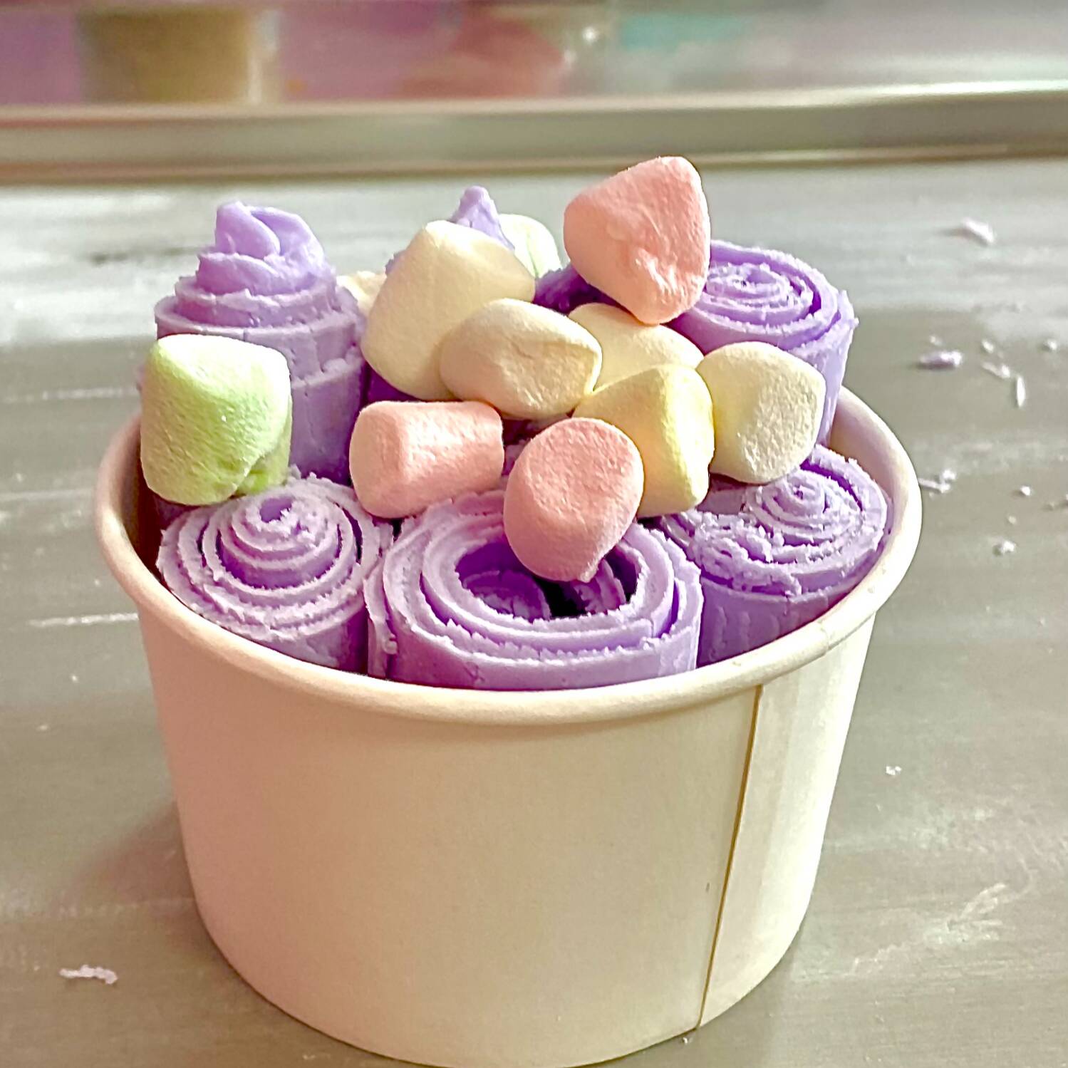 Helado en rollo de base yogurt 100% natural deshidratado sabor Taro con 2 toppings a elegir.
