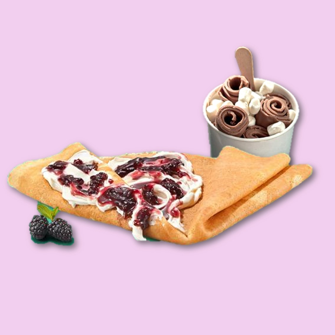 Crepa dulce a elegir + helado en rollo a elegir, a precio especial.
