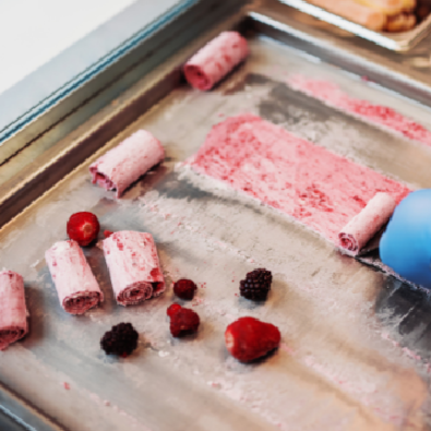 Helado en rollo de base de agua, tipo nieve con fresas, moras azules, zarzamoras, frambuesas y 2 toppings a elegir.