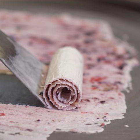 Helado en rollo de base cremosa de frambuesas y blueberries con 2 toppings a elegir.