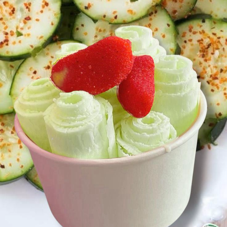 Helado en rollo base agua, mezcla de pepino con tajín. Con 2 toppings a elegir.