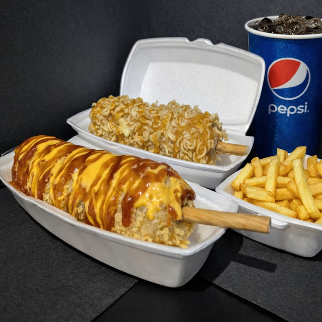 2 banderillas de queso + 1 orden de papas chicas y 2 refrescos con topping a elegir (clásica, ramen, papa, doritos, takis fuego, flaming) y aderezos para tus papas y banderilllas. Haznos saber en las instrucciones para prepararlas como mas te gusten