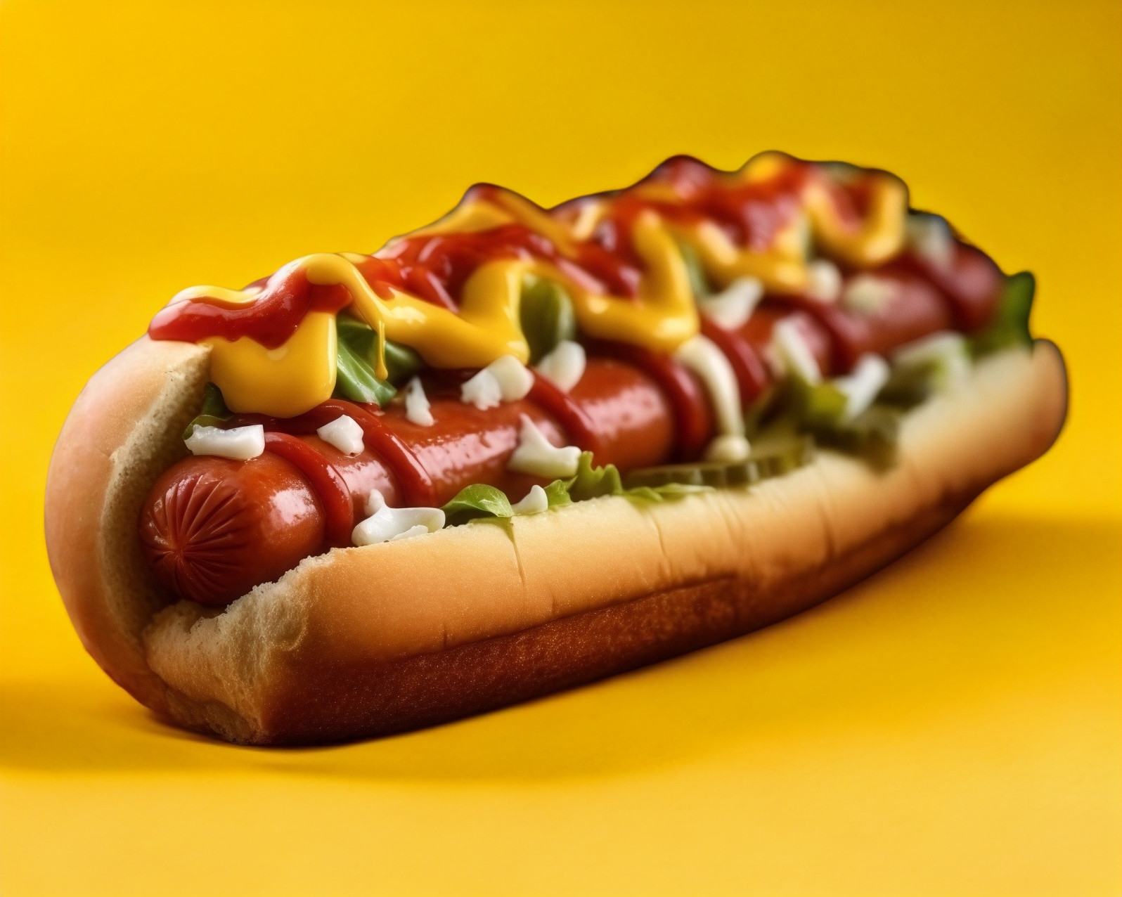 Salchicha con tocino, cebolla caramelizada, jitomate, catsup y mayonesa; INCLUYE PAPAS
