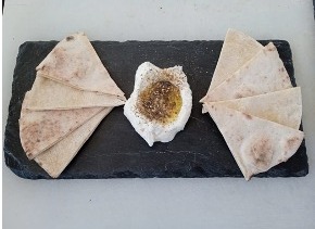 Jocoque seco con za'atar y aceite de olivo. Servido con dos piezas de pan árabe artesanal.