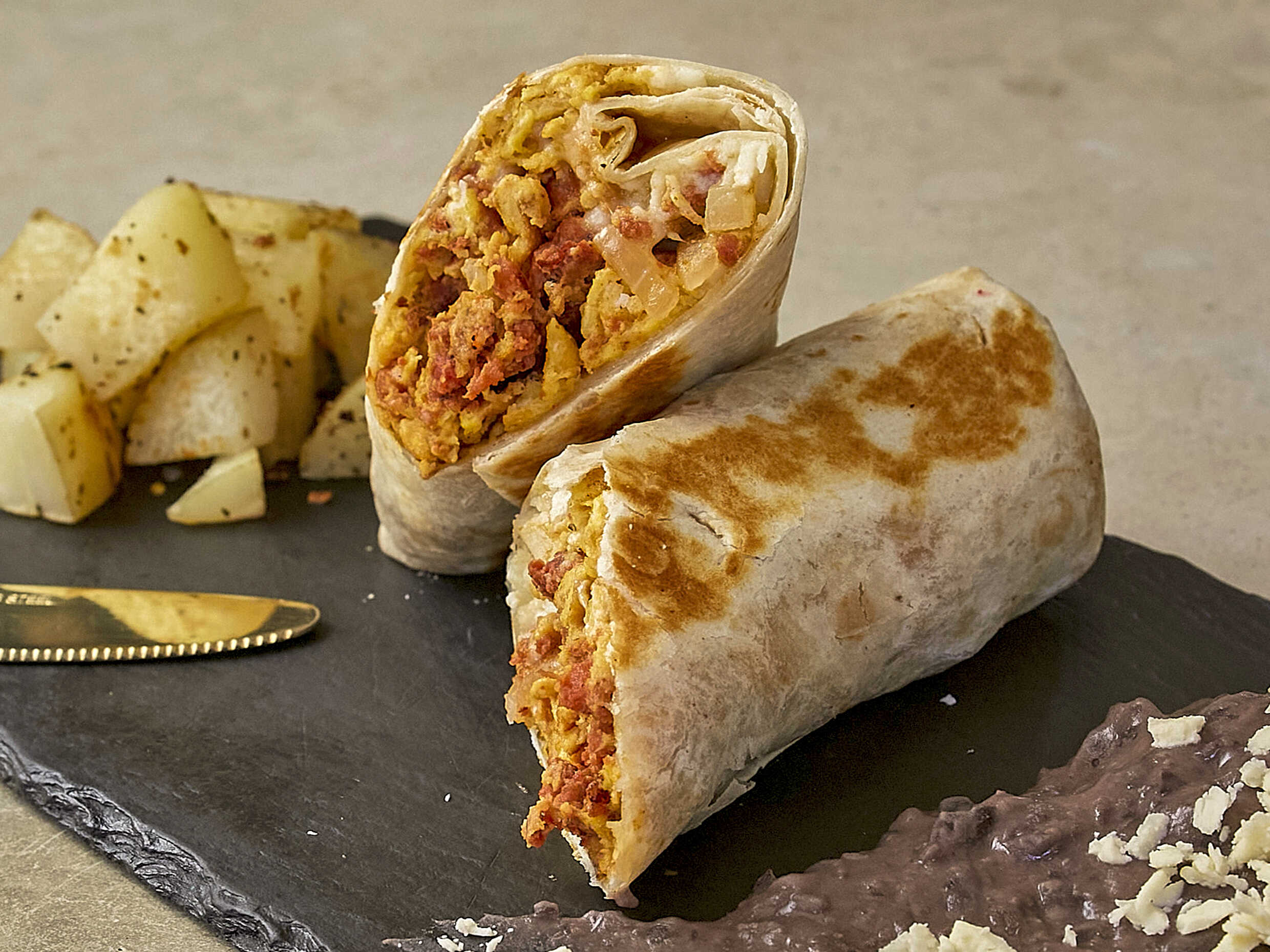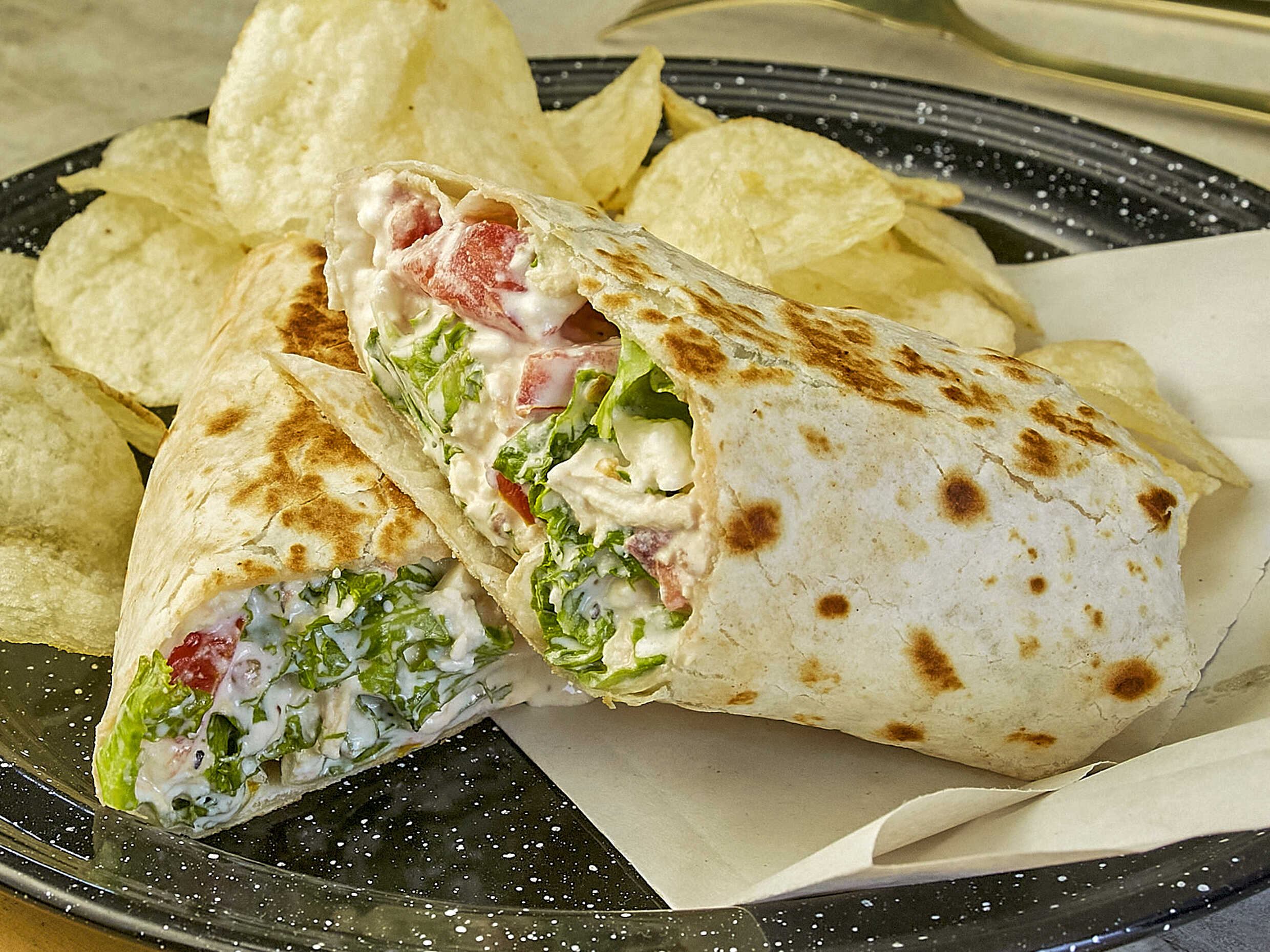 Envuelto en tortilla de harina con pollo, queso fetta, mayonesa, jitomate y lechuga. Servido con papas caseras.