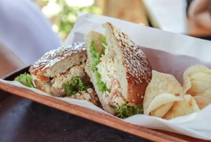 Sándwich de pan brioche con salmón ahumado, aguacate, queso crema, alcaparras y huevo duro.