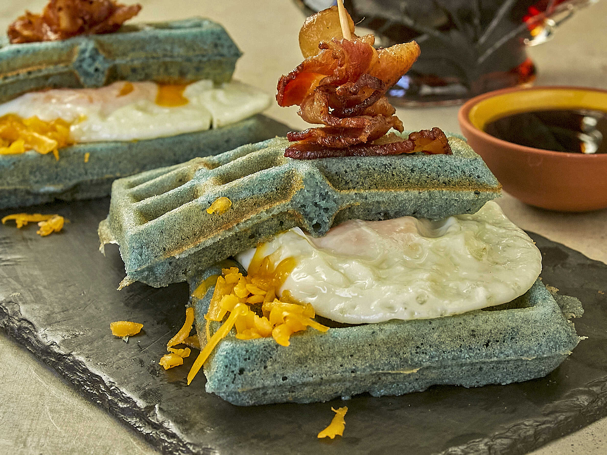 Dos huevos montados sobre dos waffles de blueberries, tocino y queso cheddar.