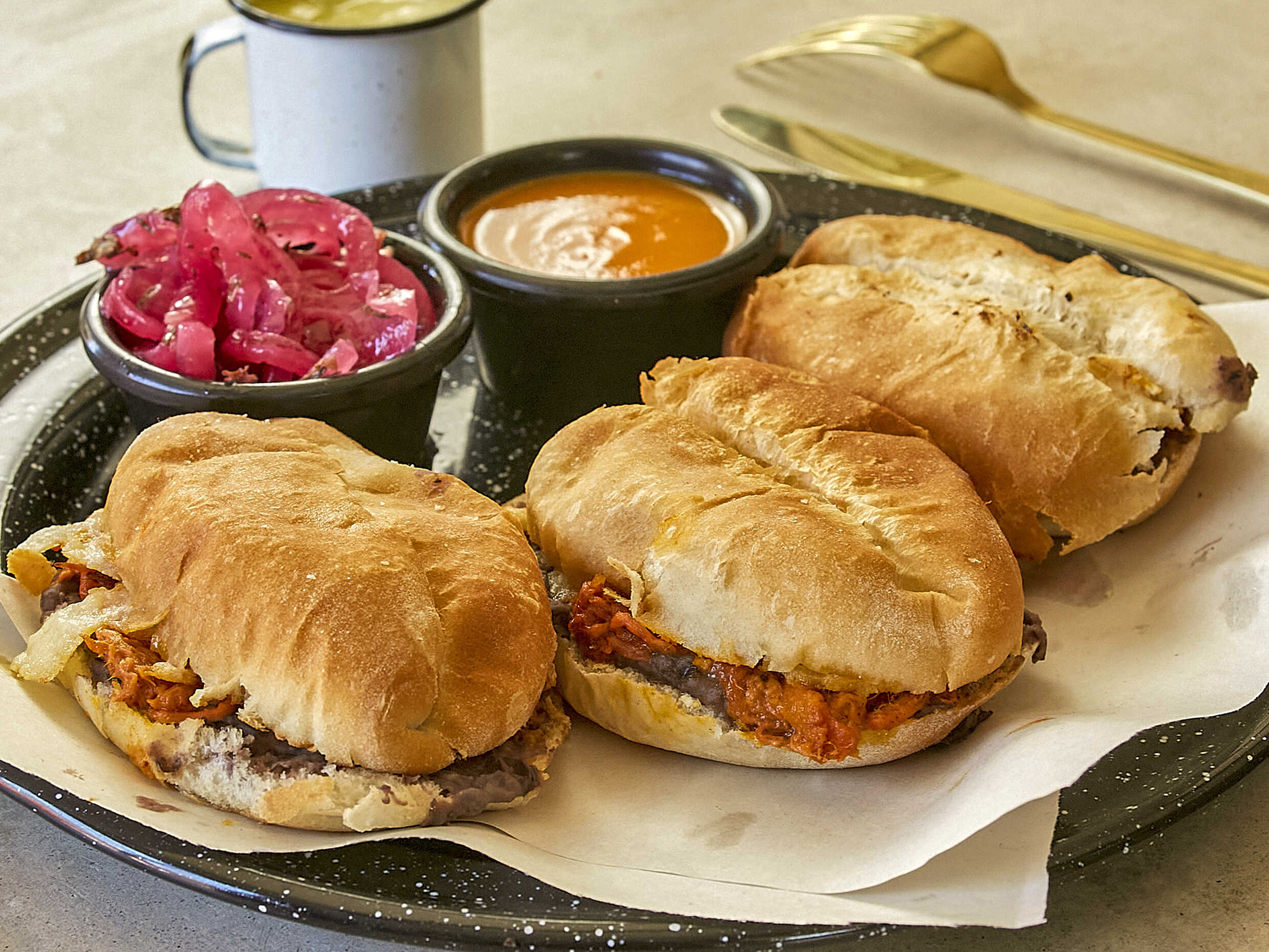 Tres tortitas de cochinita pibil con frijoles refritos y una costra de queso mozzarella. Acompañadas de cebolla morada y habaneros.