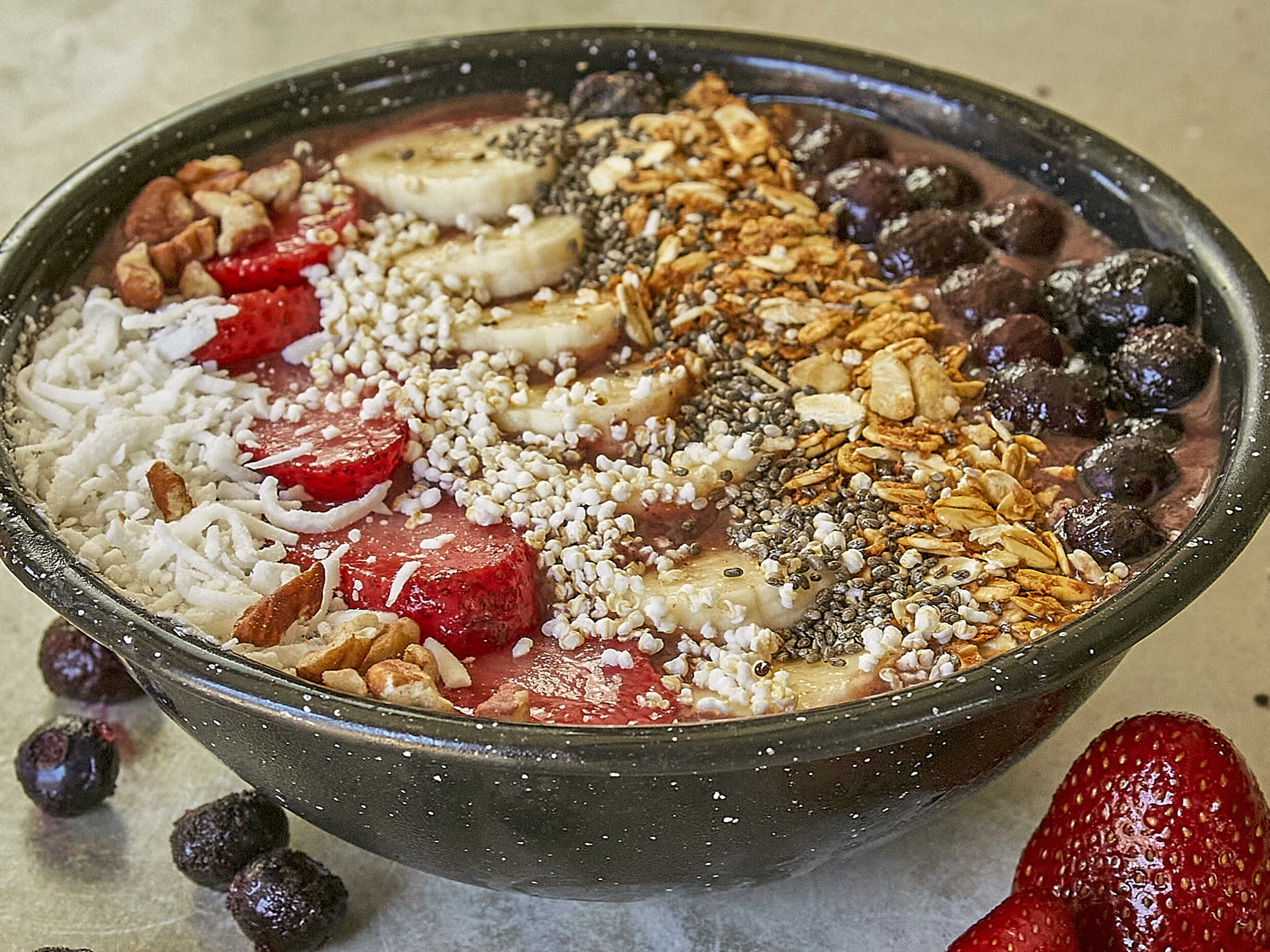 Acaí frappé con fruta, plátano, granola, blueberries y coco rallado.