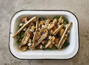 Aderezo de la casa, queso fetta, aguacate, jitomate, cacahuates, pepitas y arándanos. Agrega pollo a la plancha por un costo extra.