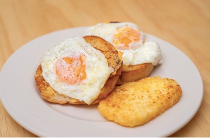Dos huevos estrellados en dos panes tostados con una costra de queso mozzarella. Acompañados de una papa hashbrown.