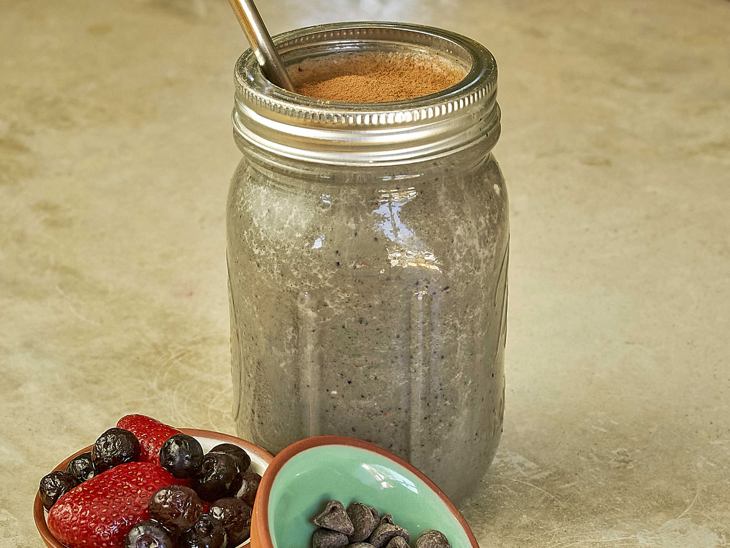 Leche de soya, proteína de chocolate, fresas, frambuesas, espinaca, crema de almendras y cacao.