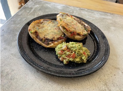 Dos panes brioche con jocoque, frijoles refritos y selección de vegetales cubiertos con costra de queso mozzarella acompañados de guacamole.