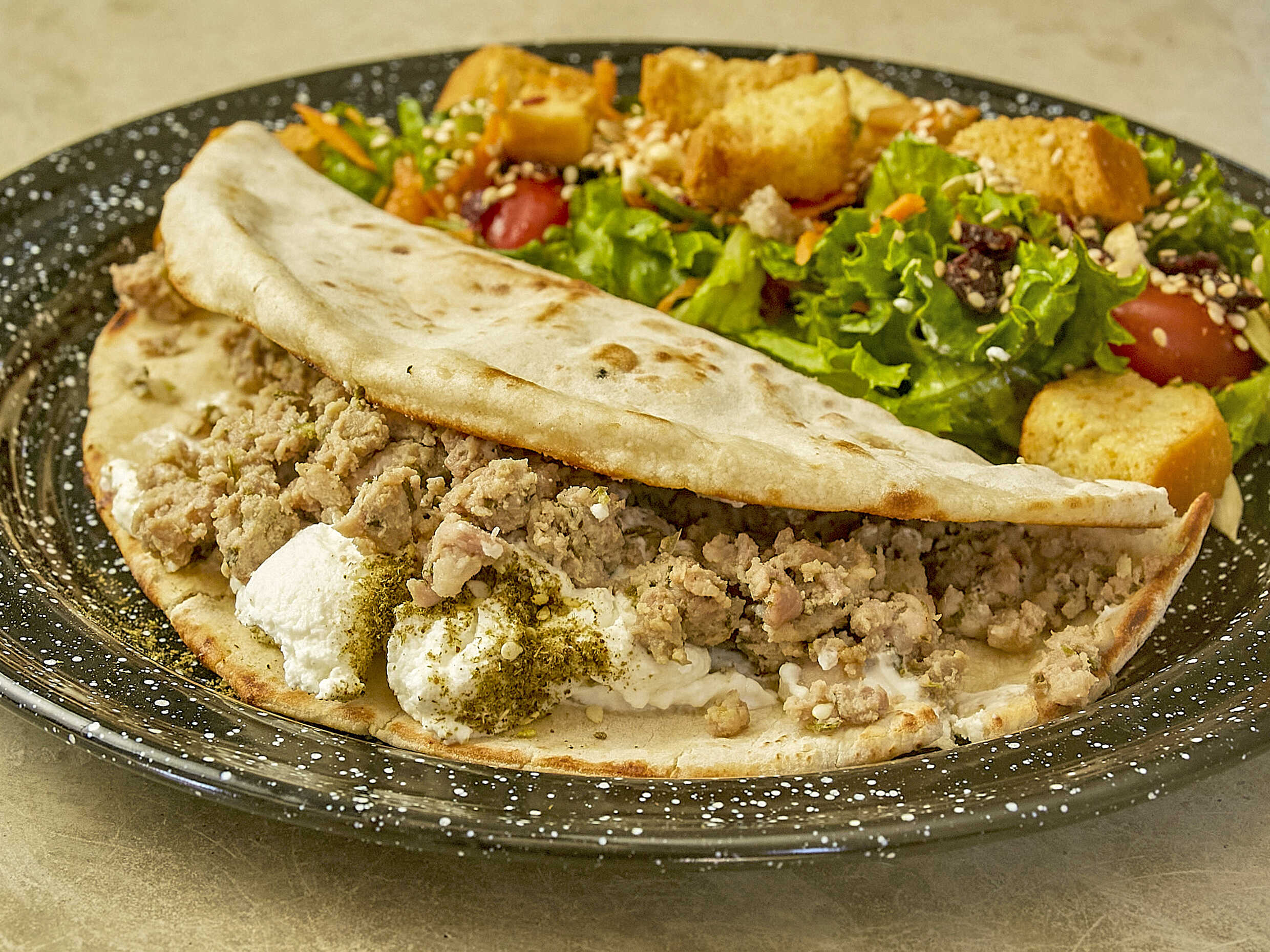 Tacote de pan árabe con una costra de queso mozzarella y carne árabe. Acompañado de jocoque y ensalada.