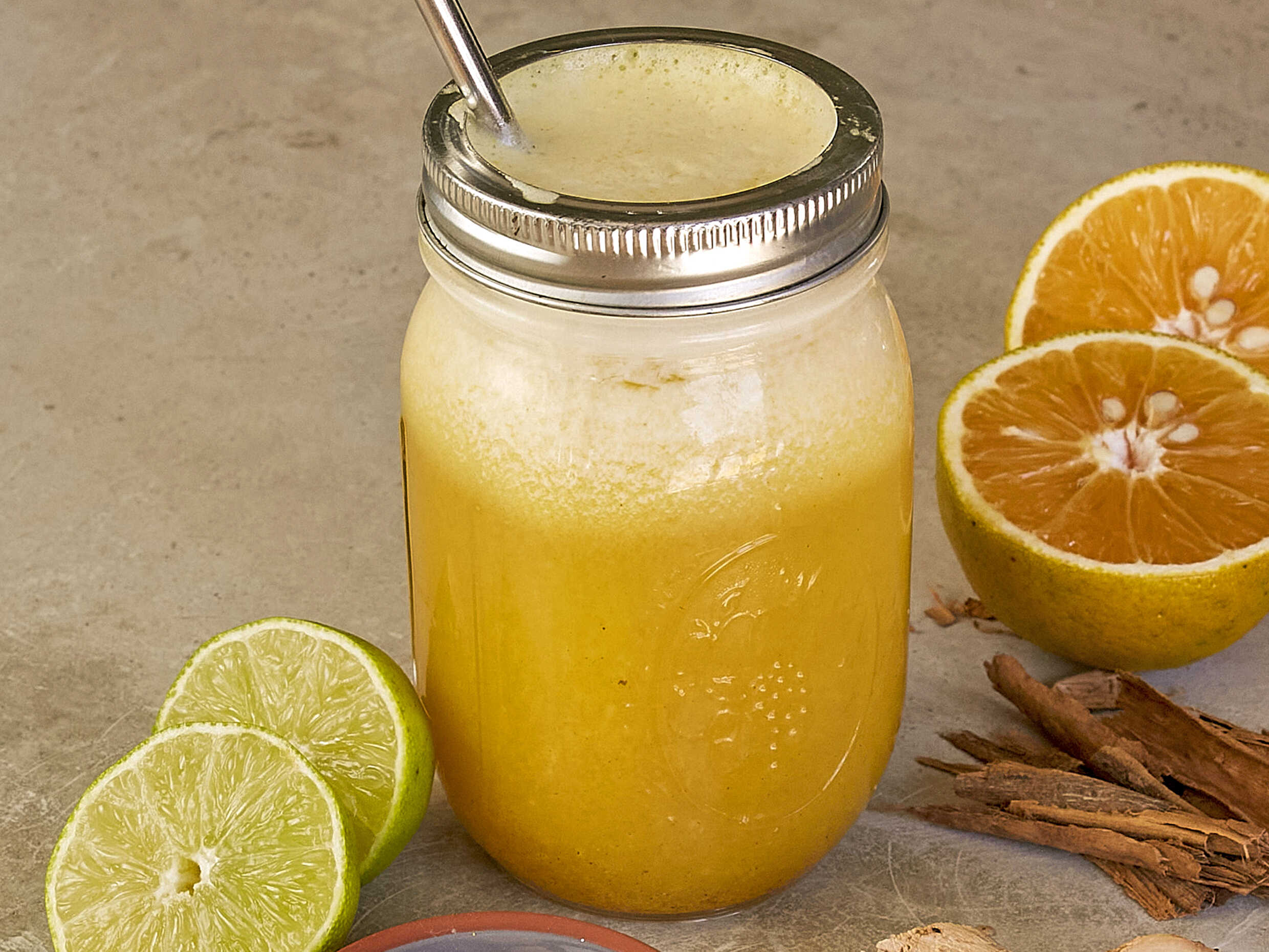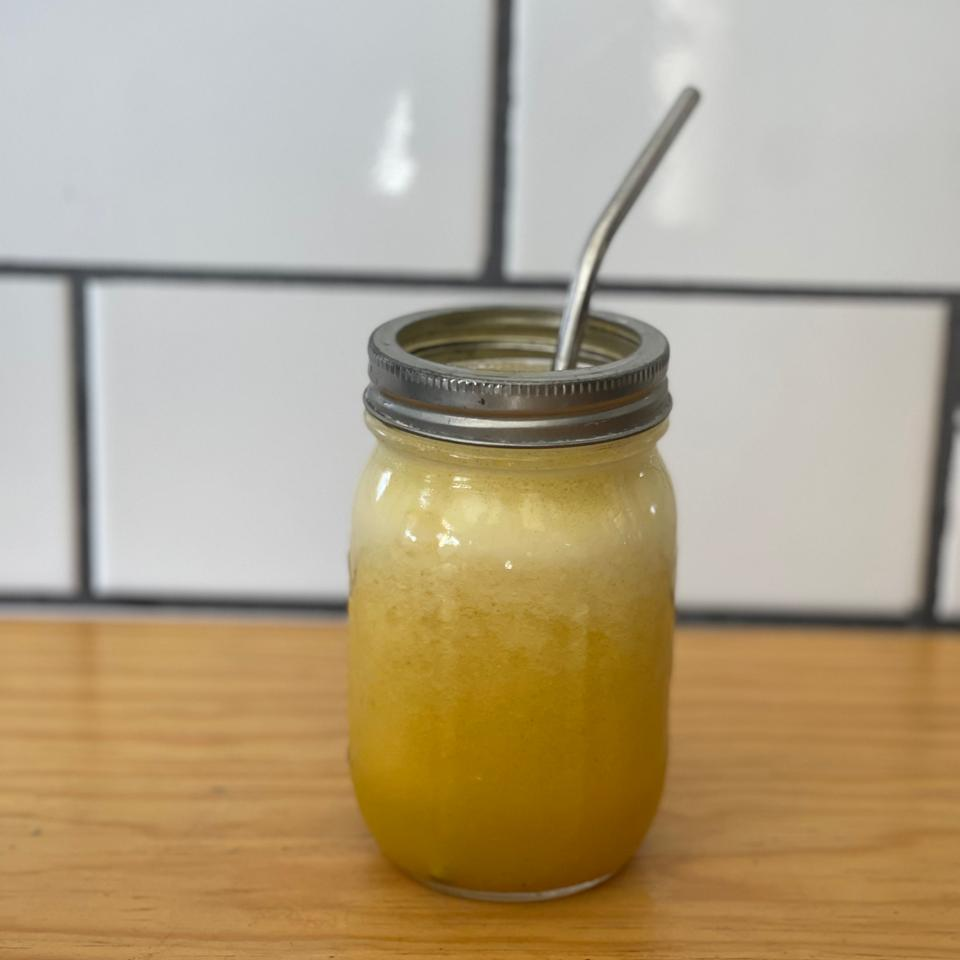 Limón, naranja, piña, cúrcuma, jengibre, canela y miel de agave.