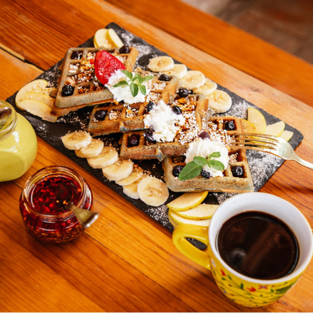 Cutro waffles de blueberries con fruta de temporada, crema batida y amaranto.