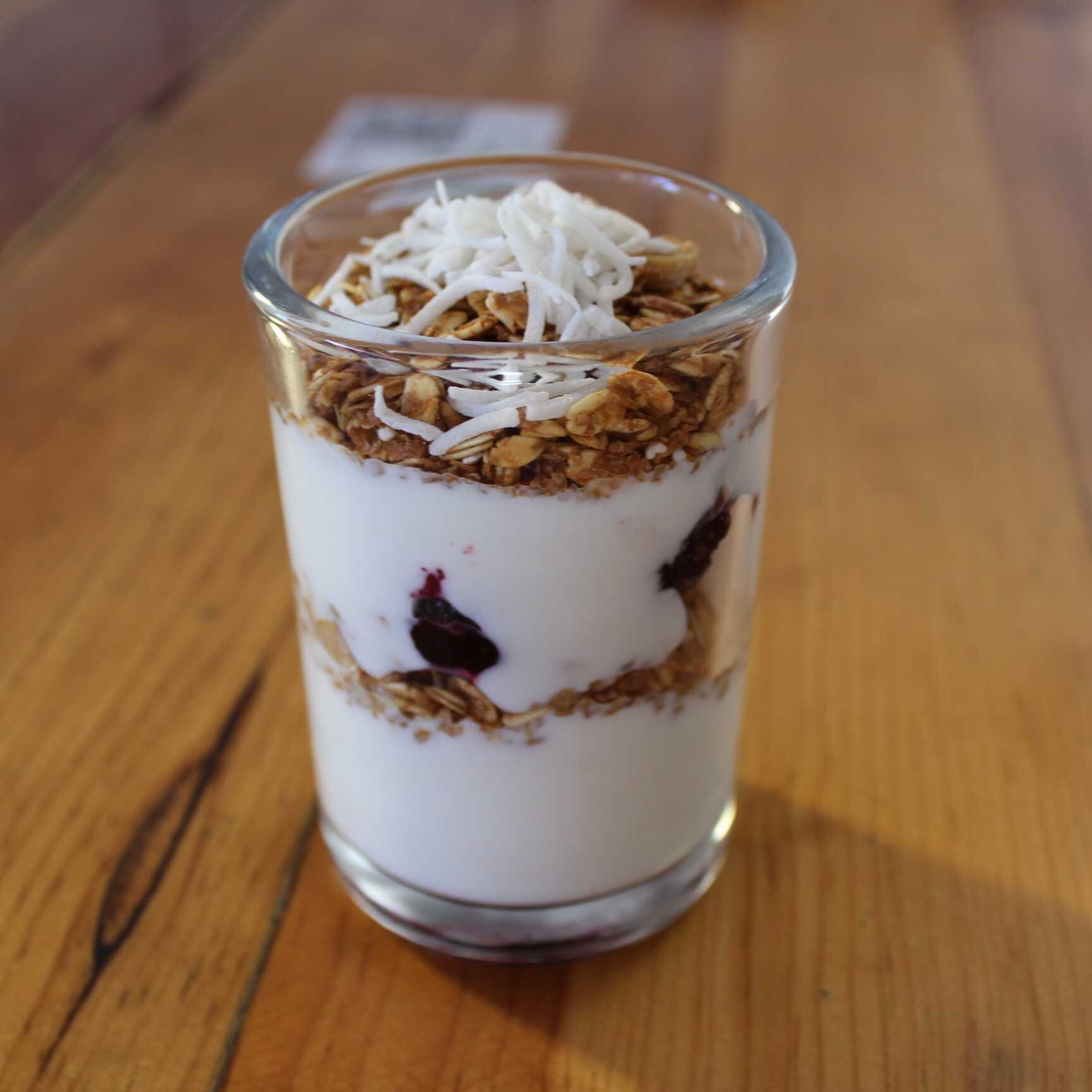 Vaso con yogut natural, frutos rojos, coco rallado y granola.