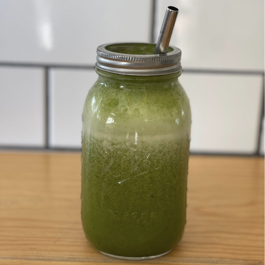 Manzana, limón, kale, espinaca, plátano, blueberries, espirulina y maca.
