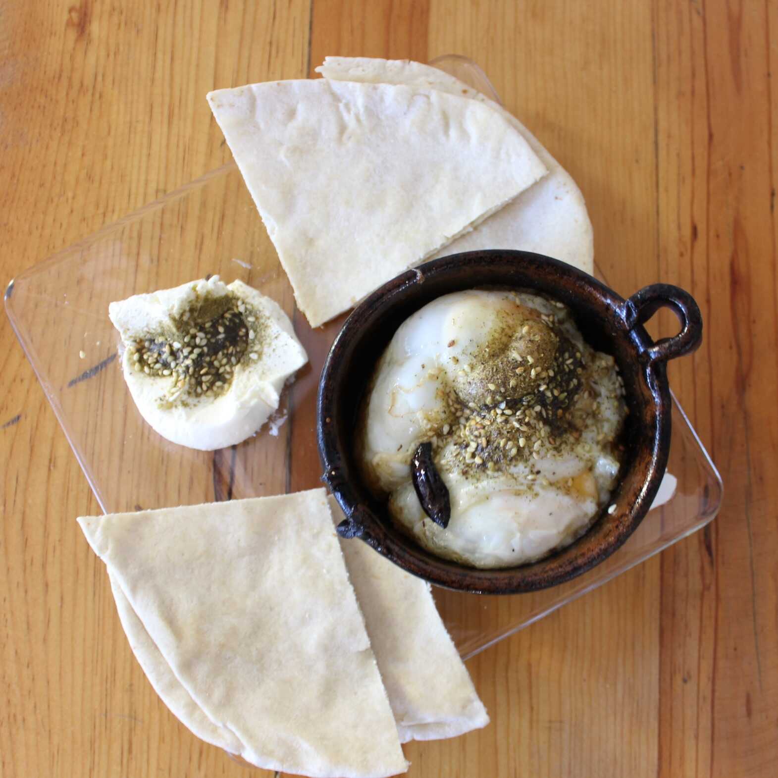 Estrellados en una cazuela de barro con za'atar. Acompañados de jocoque y pan árabe.
