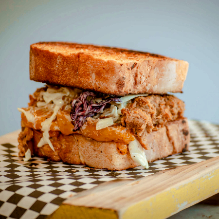 Sandwich de pan de caja tostado, relleno con pulled pork y queso cheddar, acompañado de ensalada de col