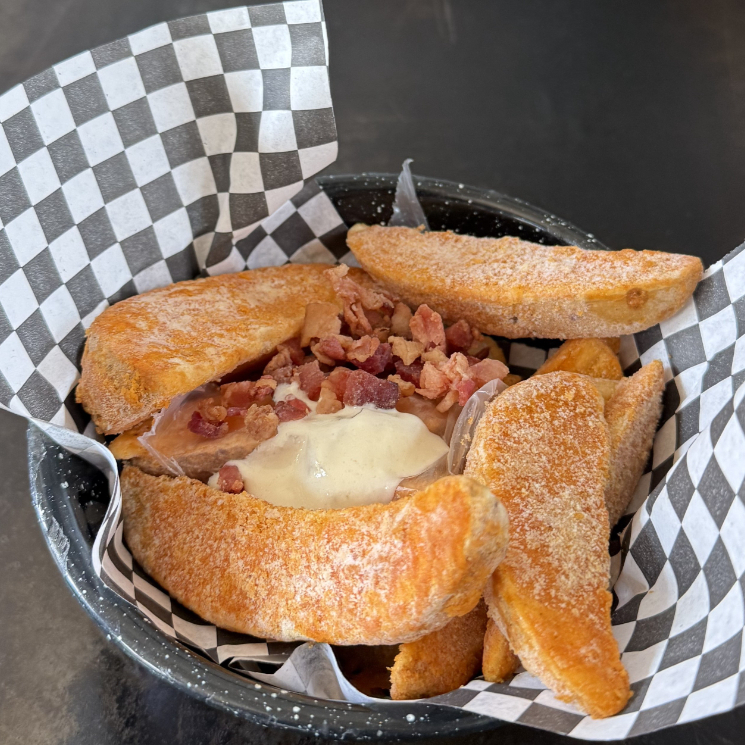 Orden de papas gajo servidas con nuestra salsa cremosa de 7 quesos y tocino en trozos.