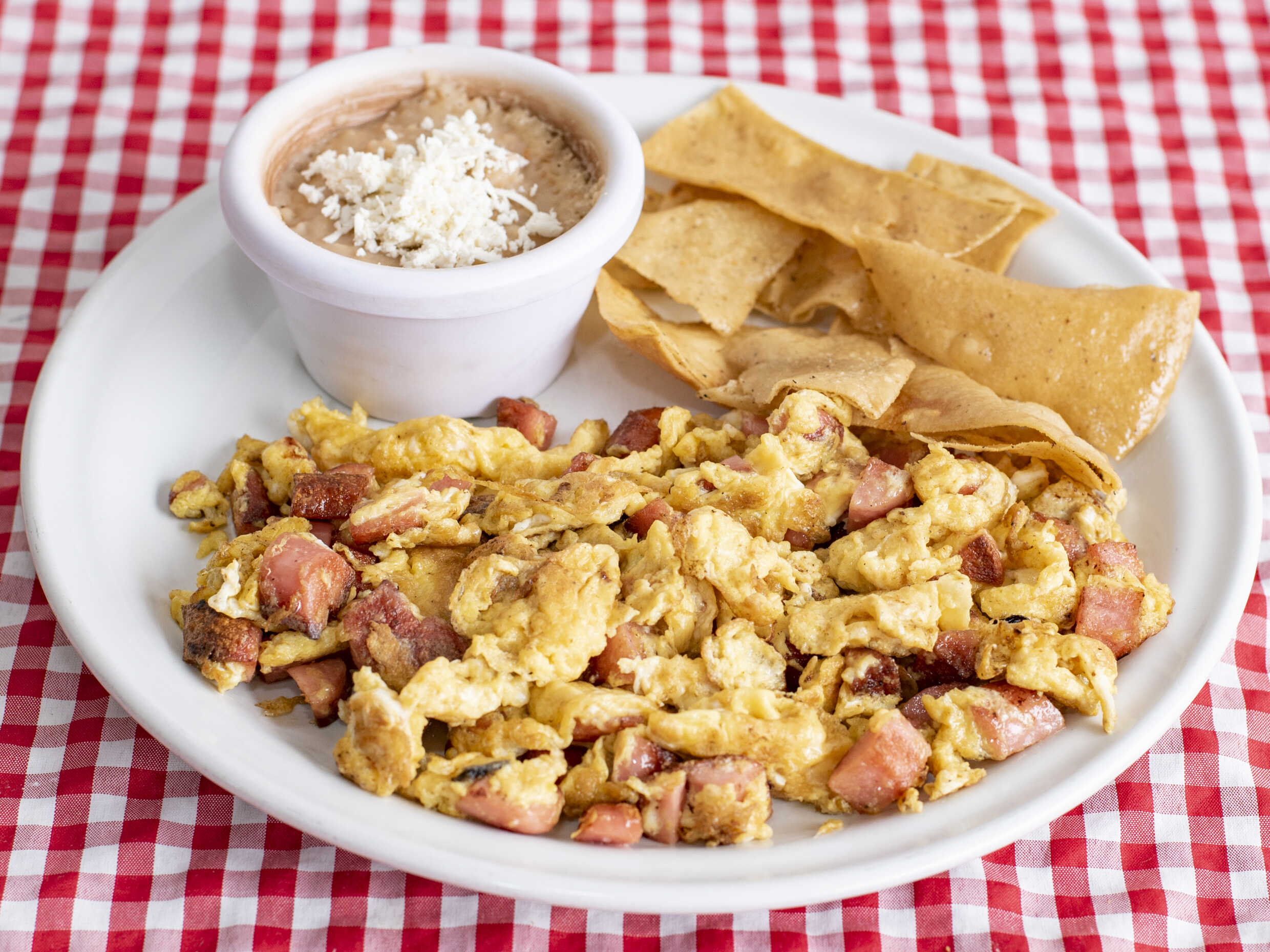 Huevos revueltos o estrellados, con salchicha, jamón, tocino o a la mexicana.