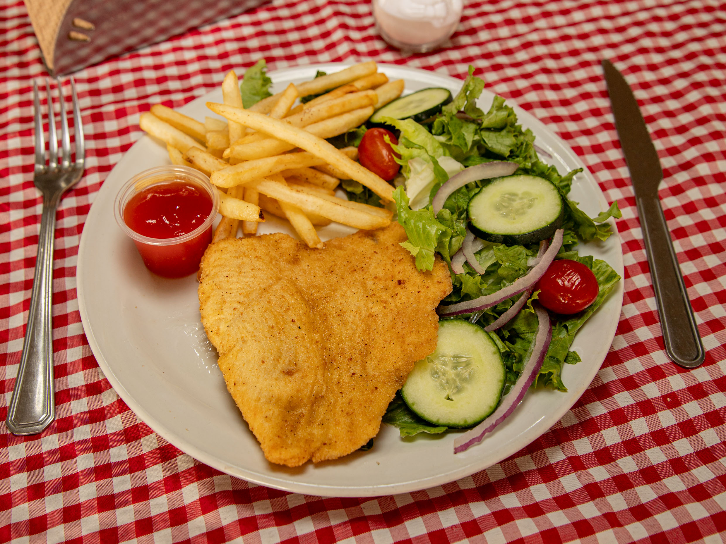 Con frijoles de la casa, papas fritas o ensalada, pechuga asada con ensalada del día.