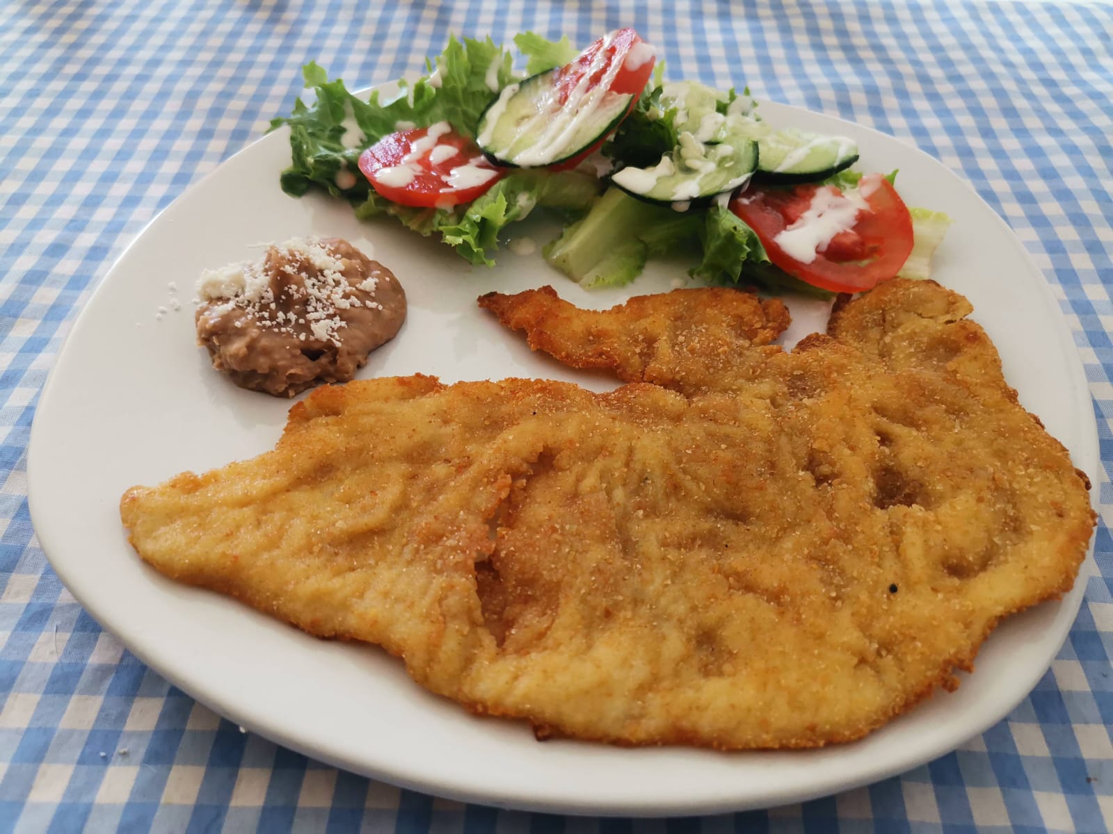 Pechuga empanizada, con jamón o salchicha y quesillo, acompañado de frijoles, 4 tortillas, ensalada del día y salsas
