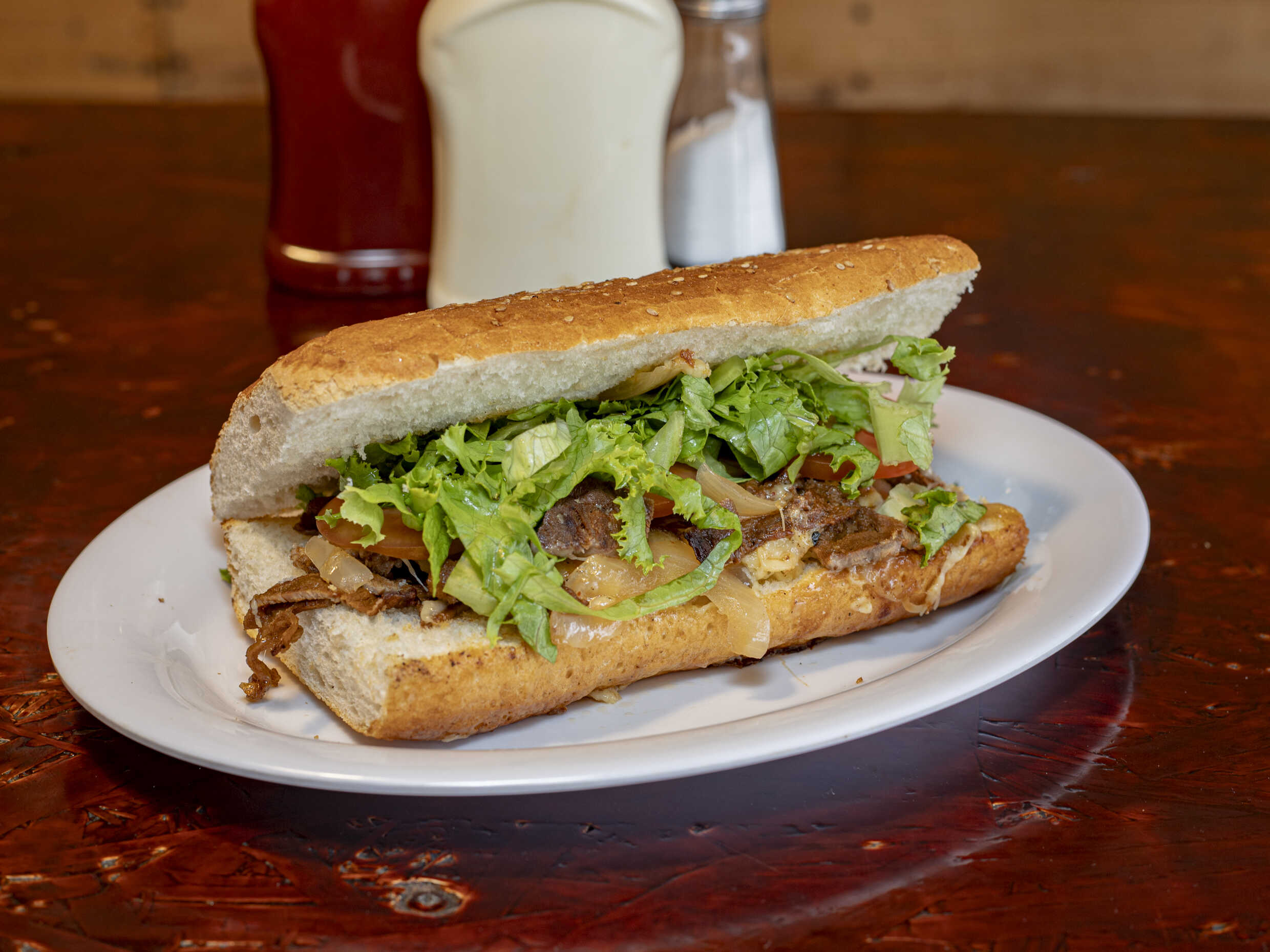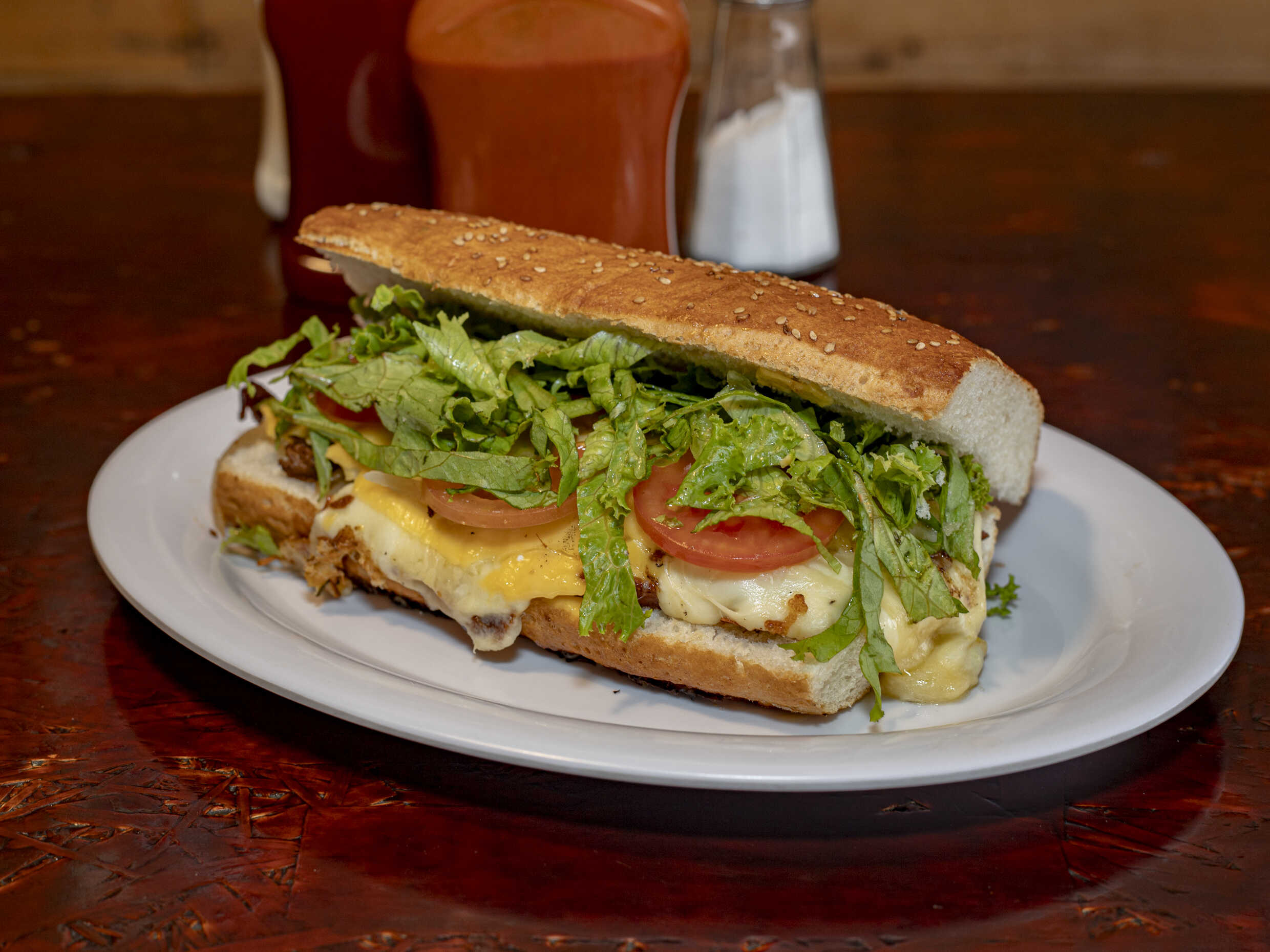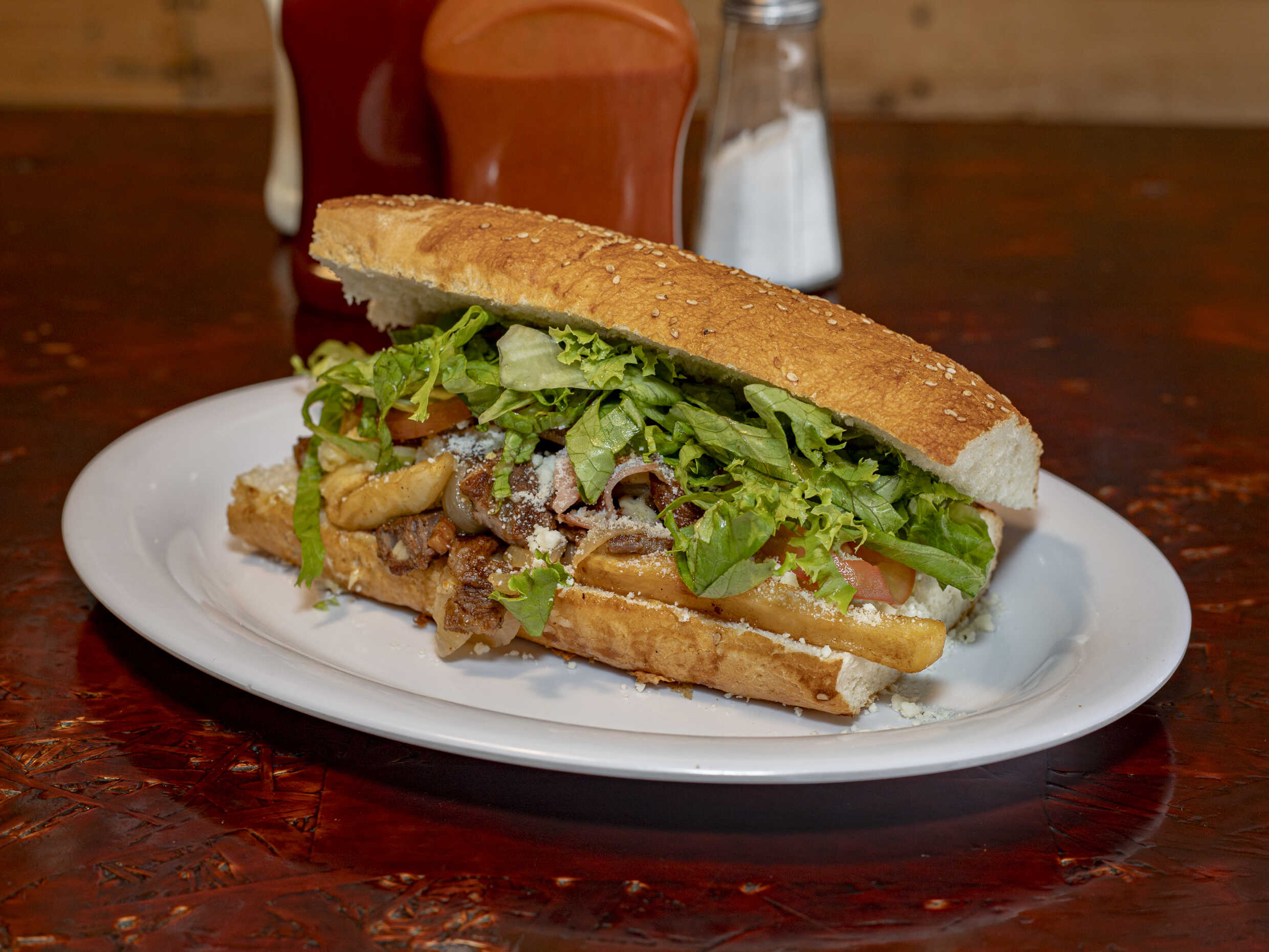 Todos los pepitos de componen de carne de res asada, cebolla caramelizada, queso manchego, jitomate, chile, lechuga y mayonesa.
