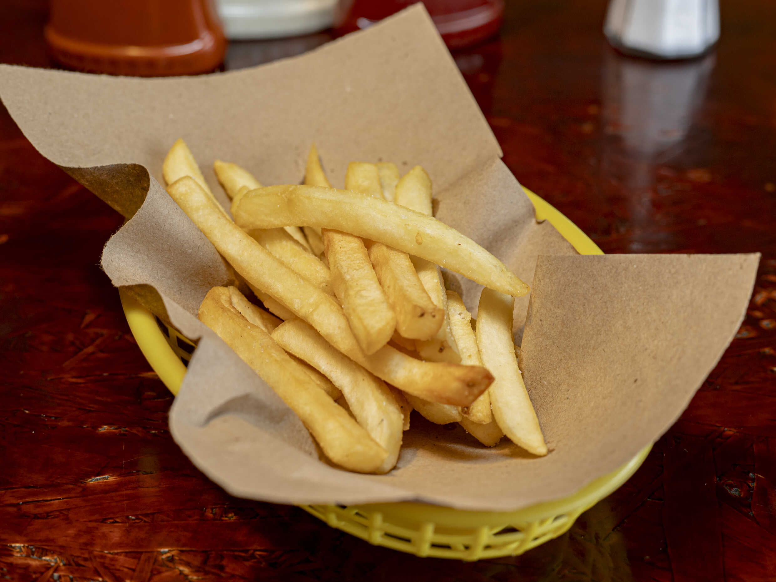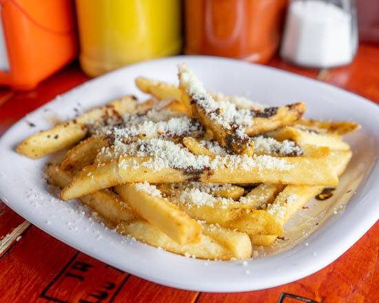 Papas a la francesa, queso parmesano, salsa maggi y chile seco.