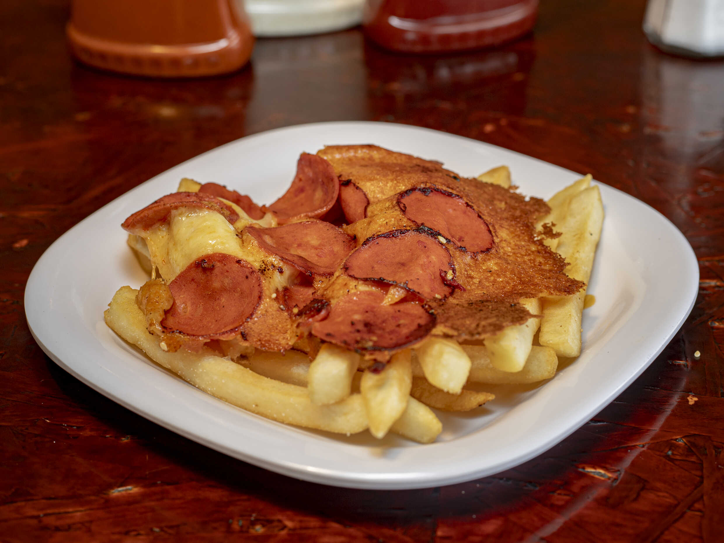 Papas a la francesa con pepperoni, queso manchego y queso cheddar.