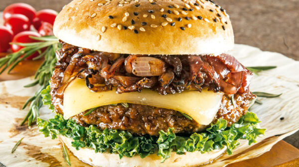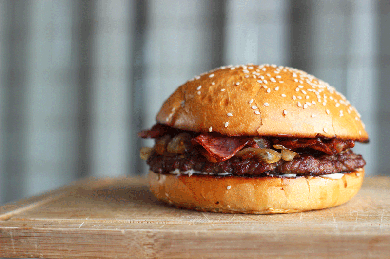Tocino, cebolla caramelizada, guacamole y queso cheddar.