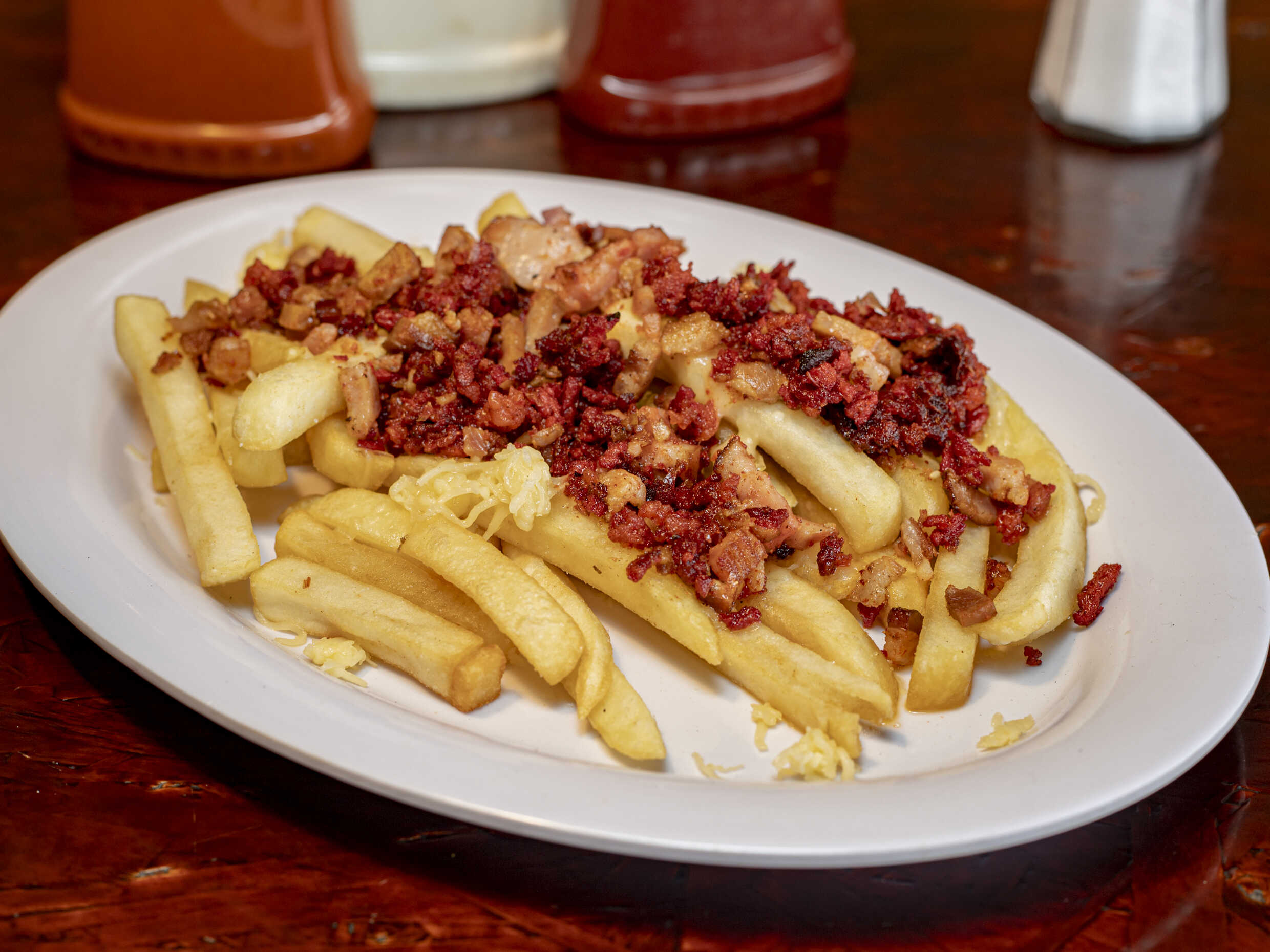 Papas a la francesa con chorizo, tocino y queso manchego.