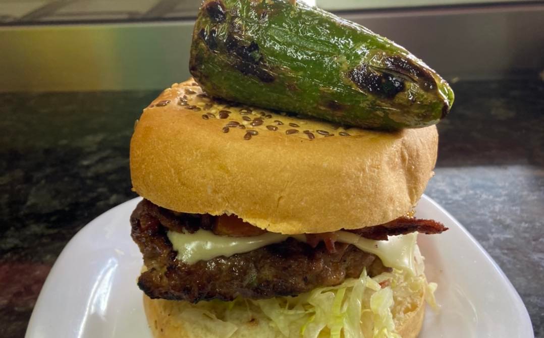 Doble carne, queso frito, guacamole, tocino caramelizado y chile toreado.