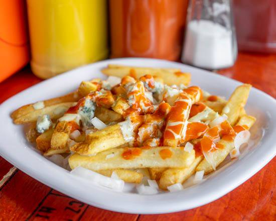 Papas a la francesa, salsa buffalo, queso azul, salsa ranch y cebolla.