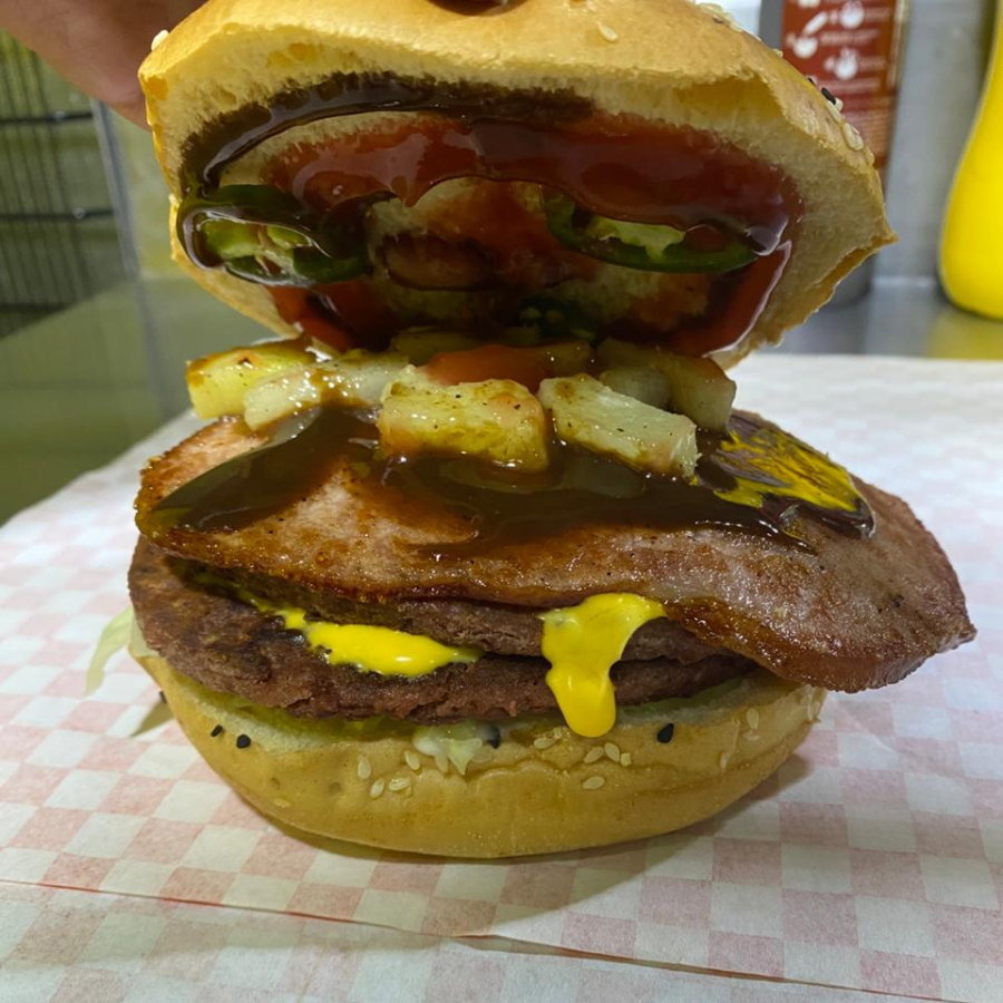 Doble carne, chuleta ahumada, piña y aderezo bbq. Incluye papas fritas