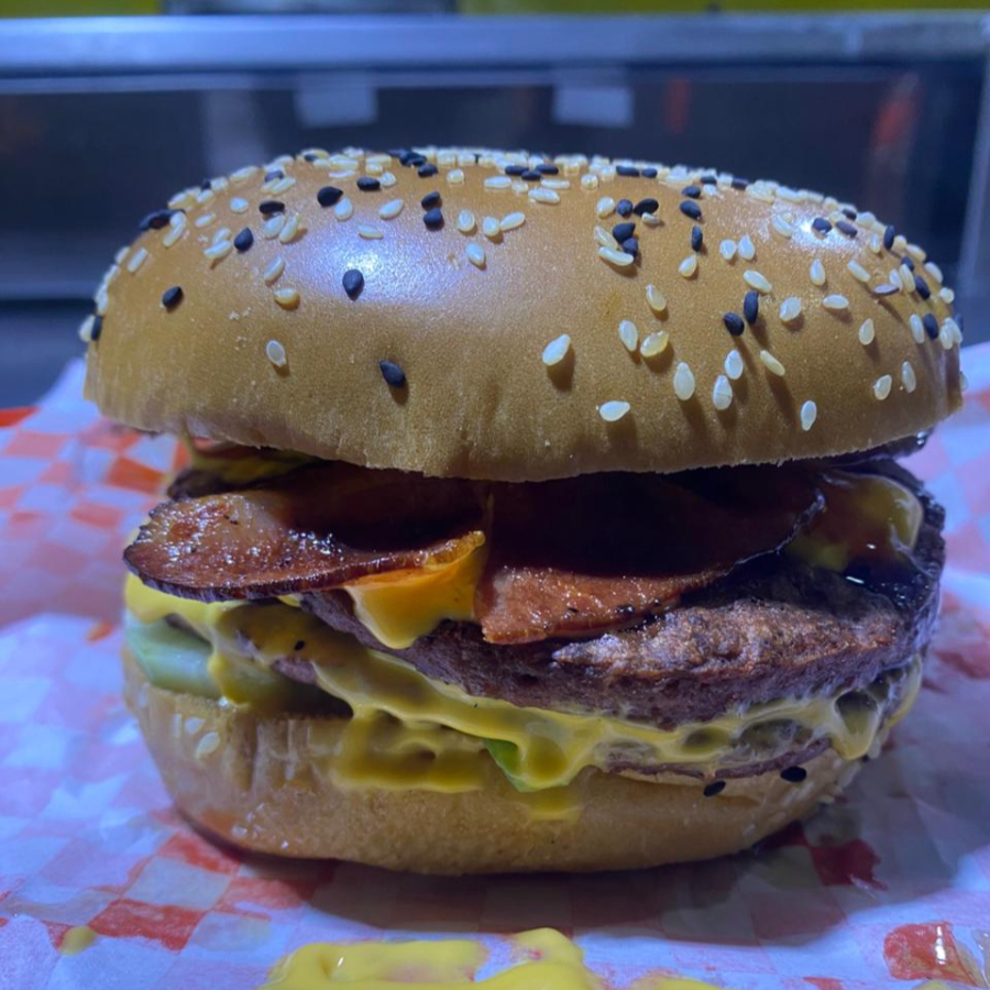 Doble carne, tocino y aderezo bqq. Incluye papas fritas