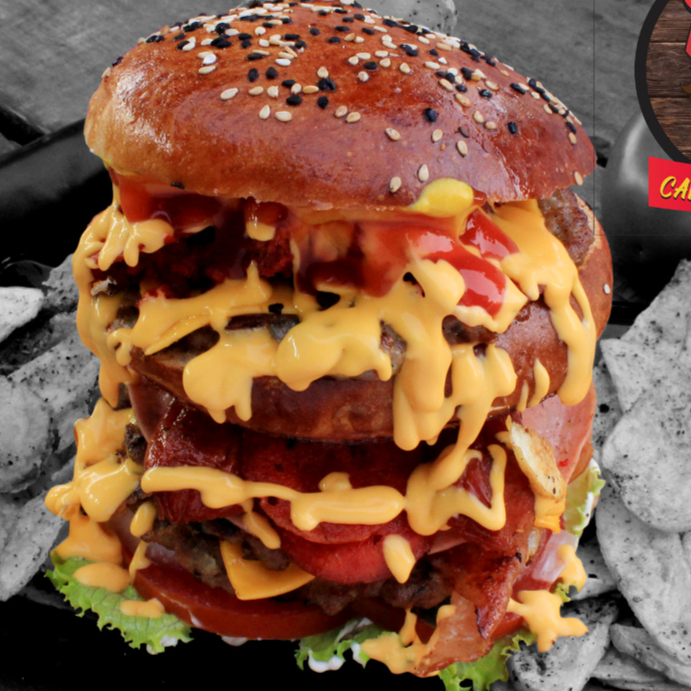 Doble carne, tocino ahumado y miel. Incluye papas fritas