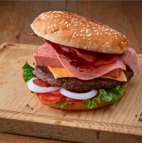 150 gr. de carne de res al carbón con queso, tocino, salchicha y jamón