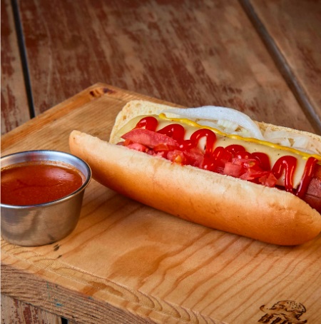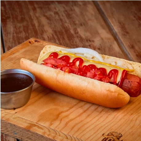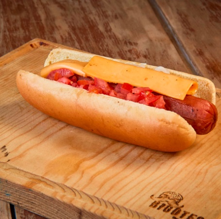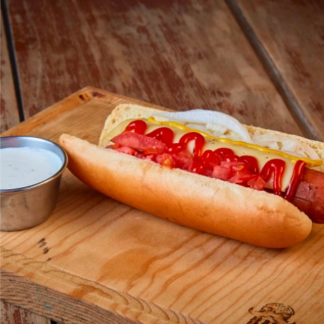 Salchicha jumbo de pavo al carbón con queso y aderezo Hot