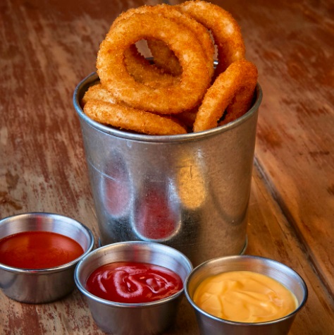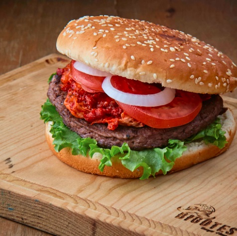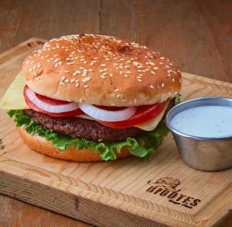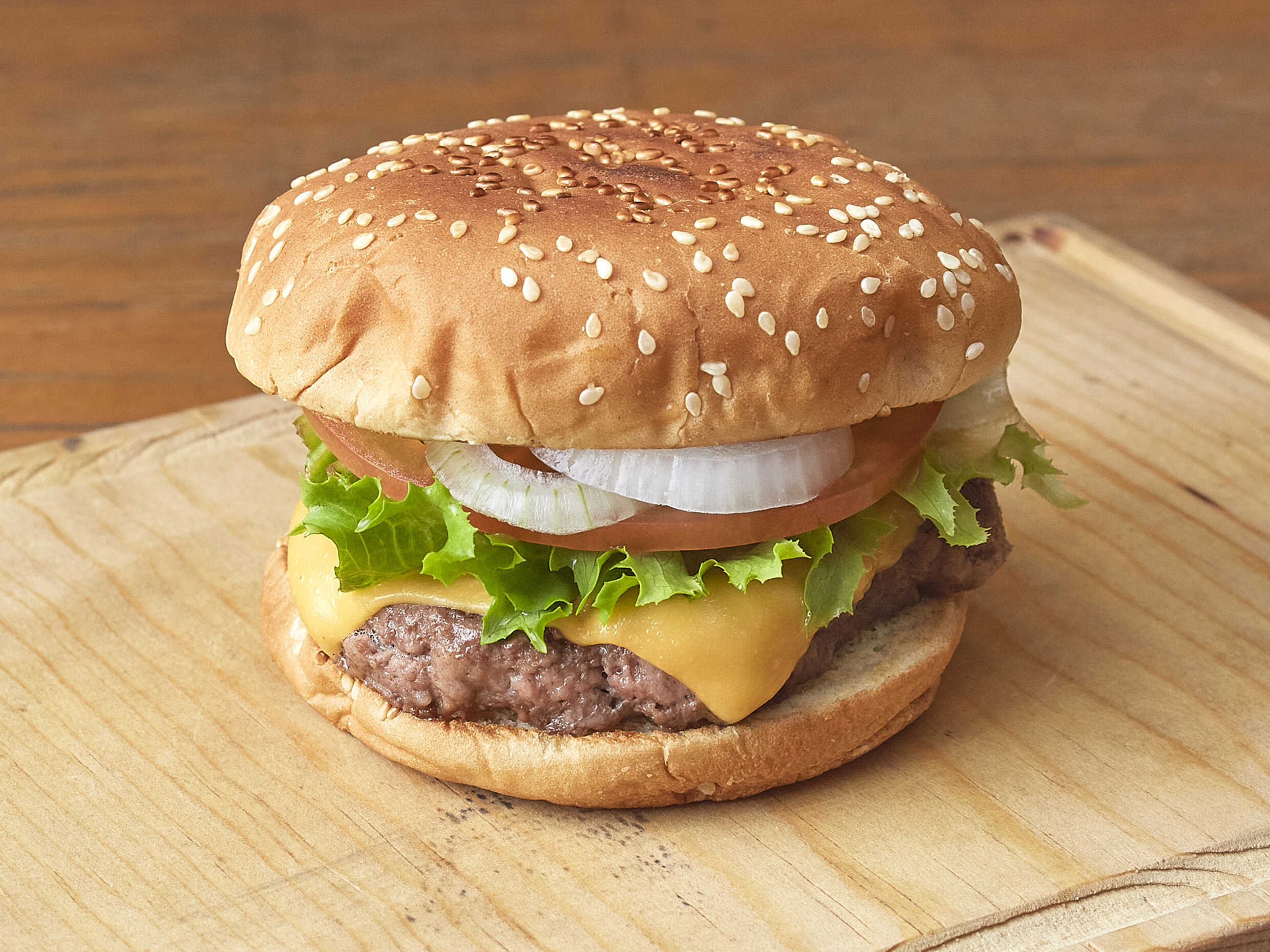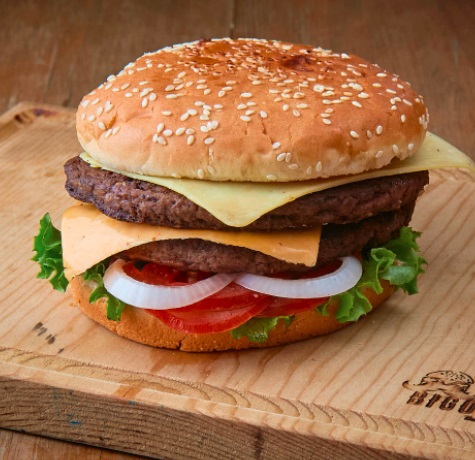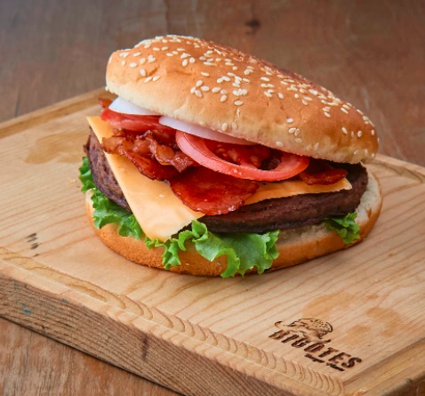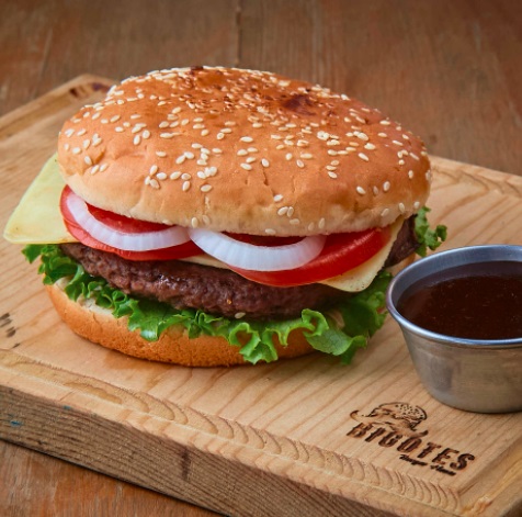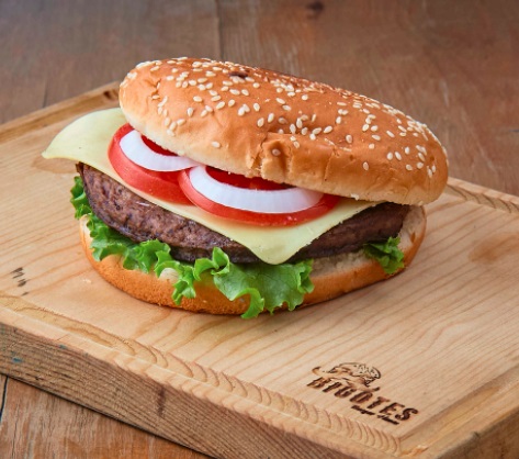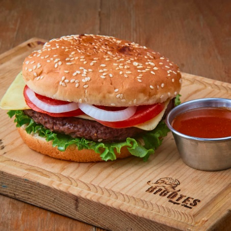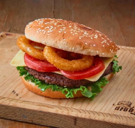 150 gr. de carne de res al carbón con queso y 2 aros de cebolla.