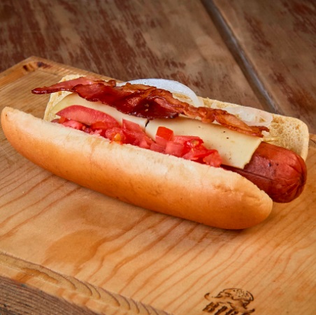 Salchicha jumbo de pavo al carbón con queso, piña y jamón.