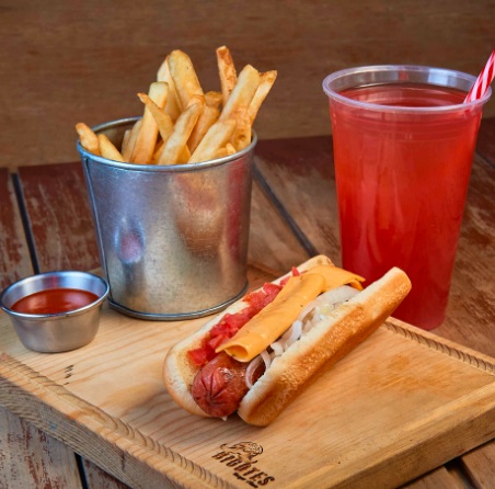 Hamburguesa con queso , hotdog con ques, papas a la francesa y bebida