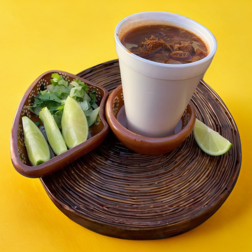 Vaso de consomé de birria sin carne acompañado de limones y verdura a elección