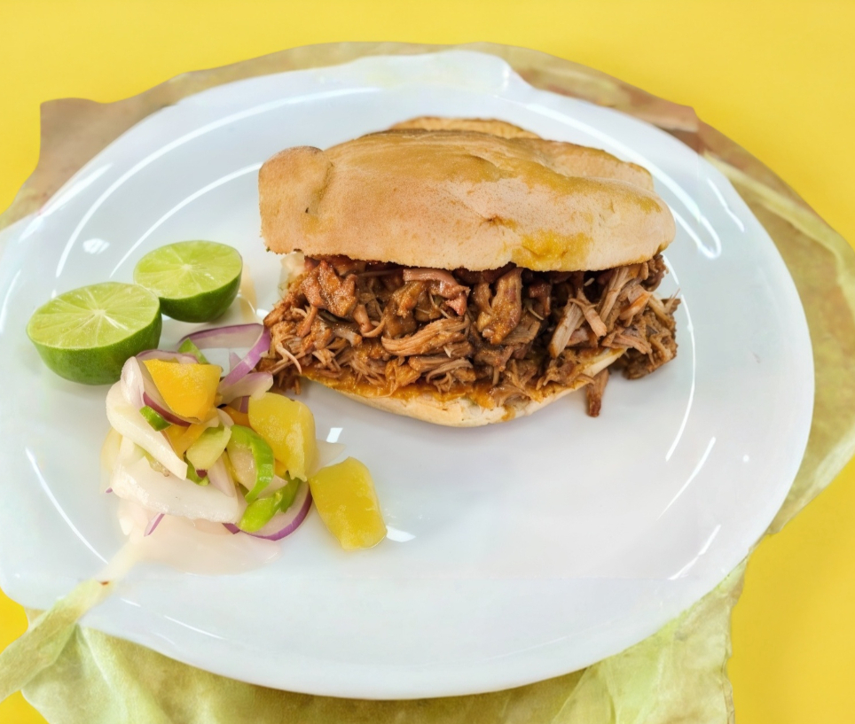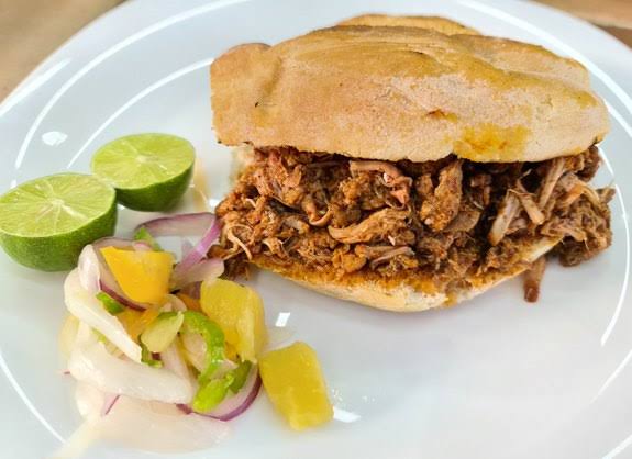 Pan estilo cemita relleno de carne de mixiote acompañado de salsas, limones, verdura y nopales a elección