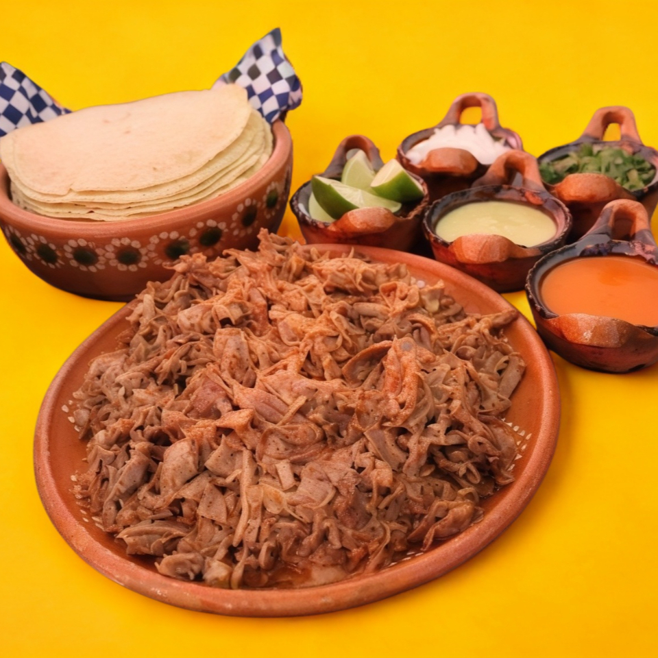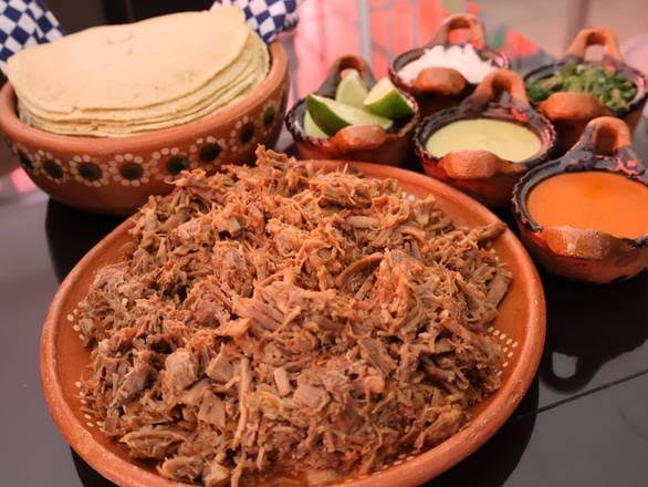 1 kilo de carne de birria acompañado de 2 litros de consomé, tortillas, 2 cemas o tortas, salsas, limones y verdura a elección