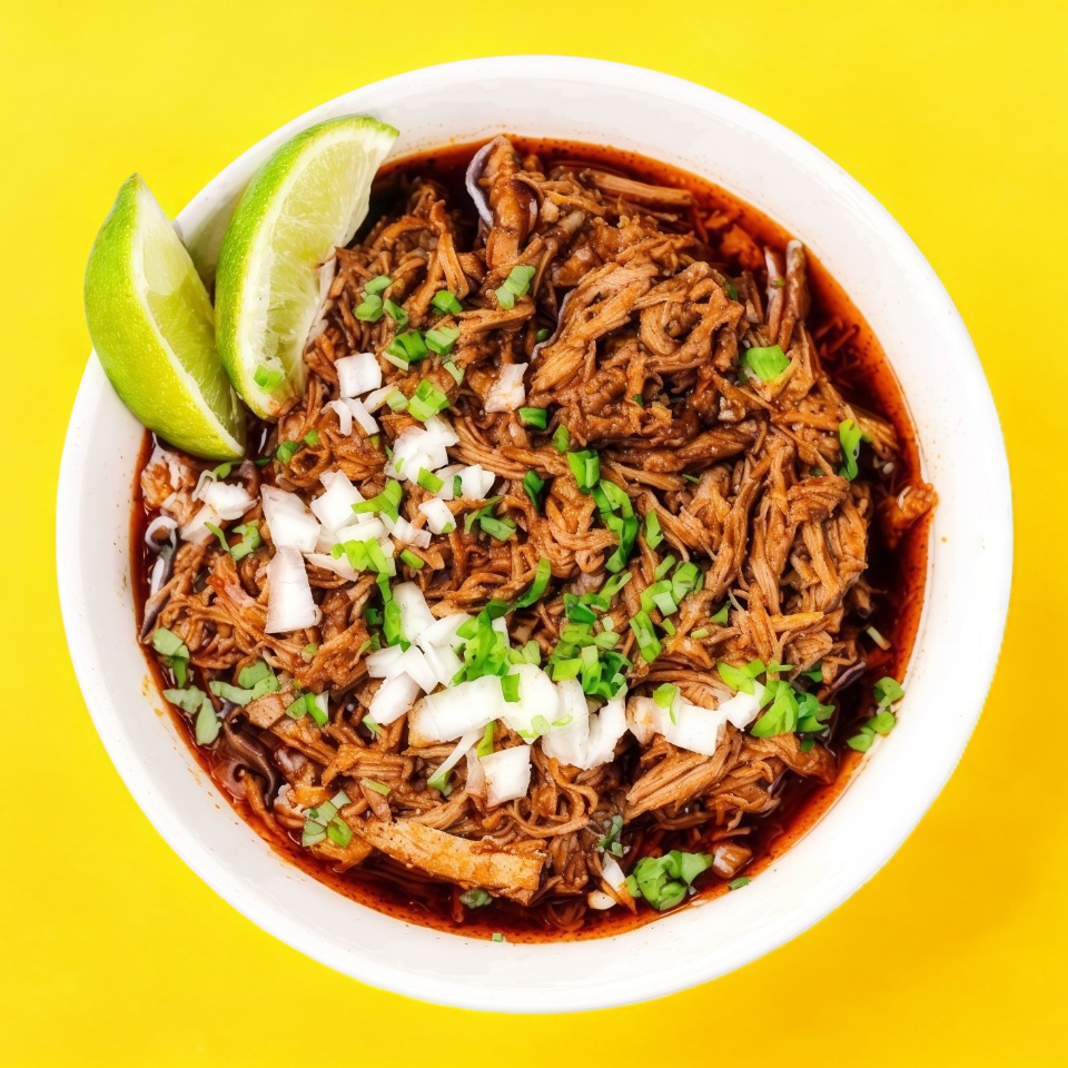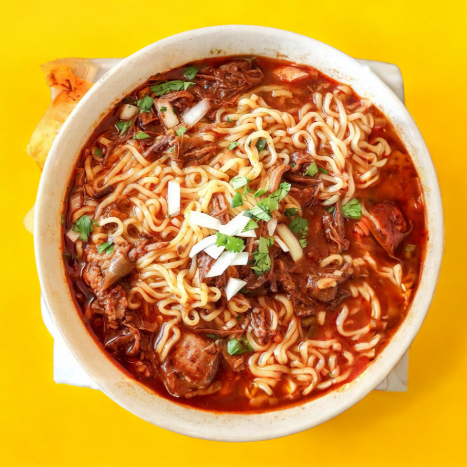 Deliciosa birria con fideos estilo ramen acompañando de cebolla, cilantro y limones