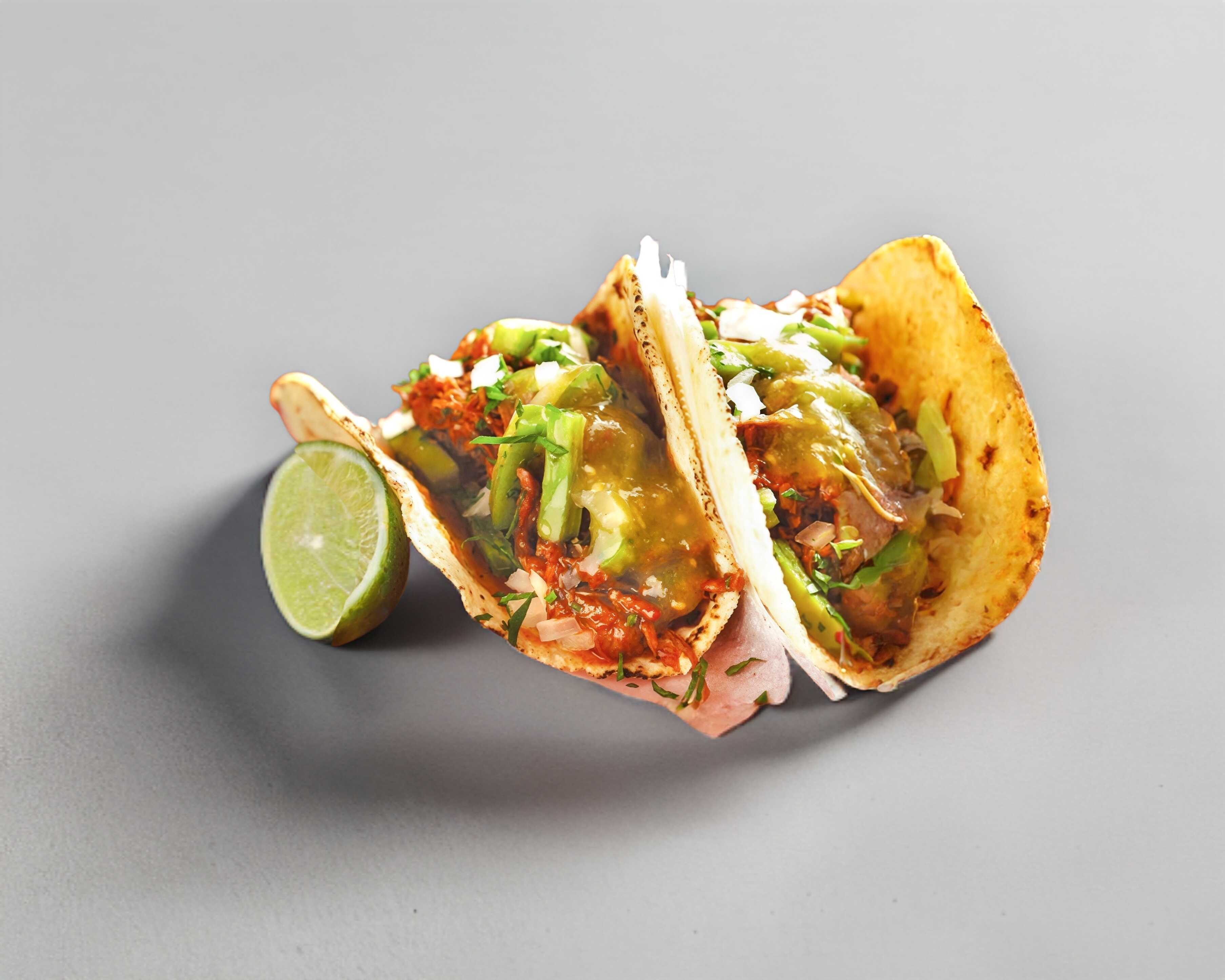 Tacos de tortilla de maíz con carne de mixiote y queso acompañado de limones, salsa, verdura y nopales a elección